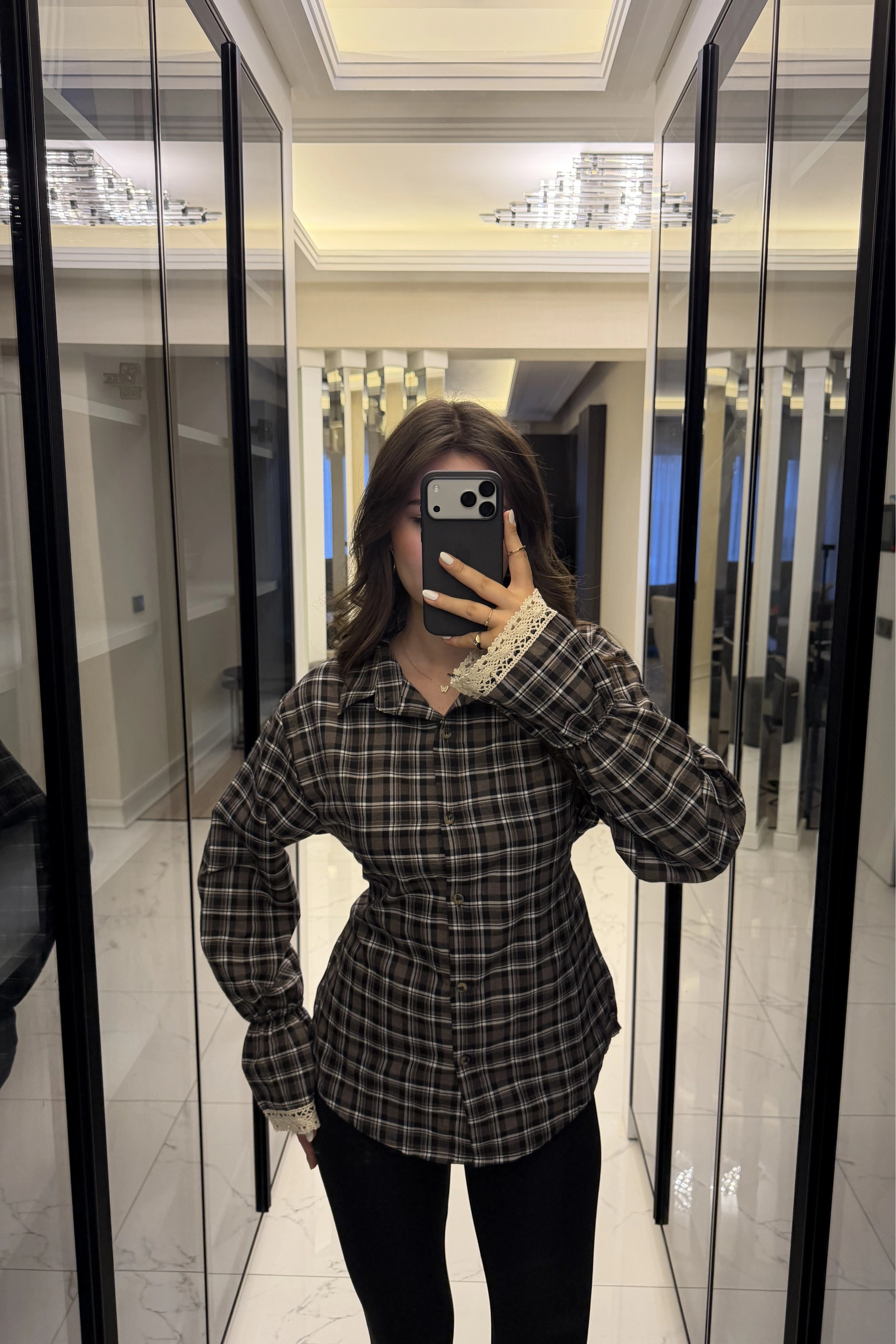 Antrasit Güpür Detaylı Belden Bağcıklı Ekose Gömlek
