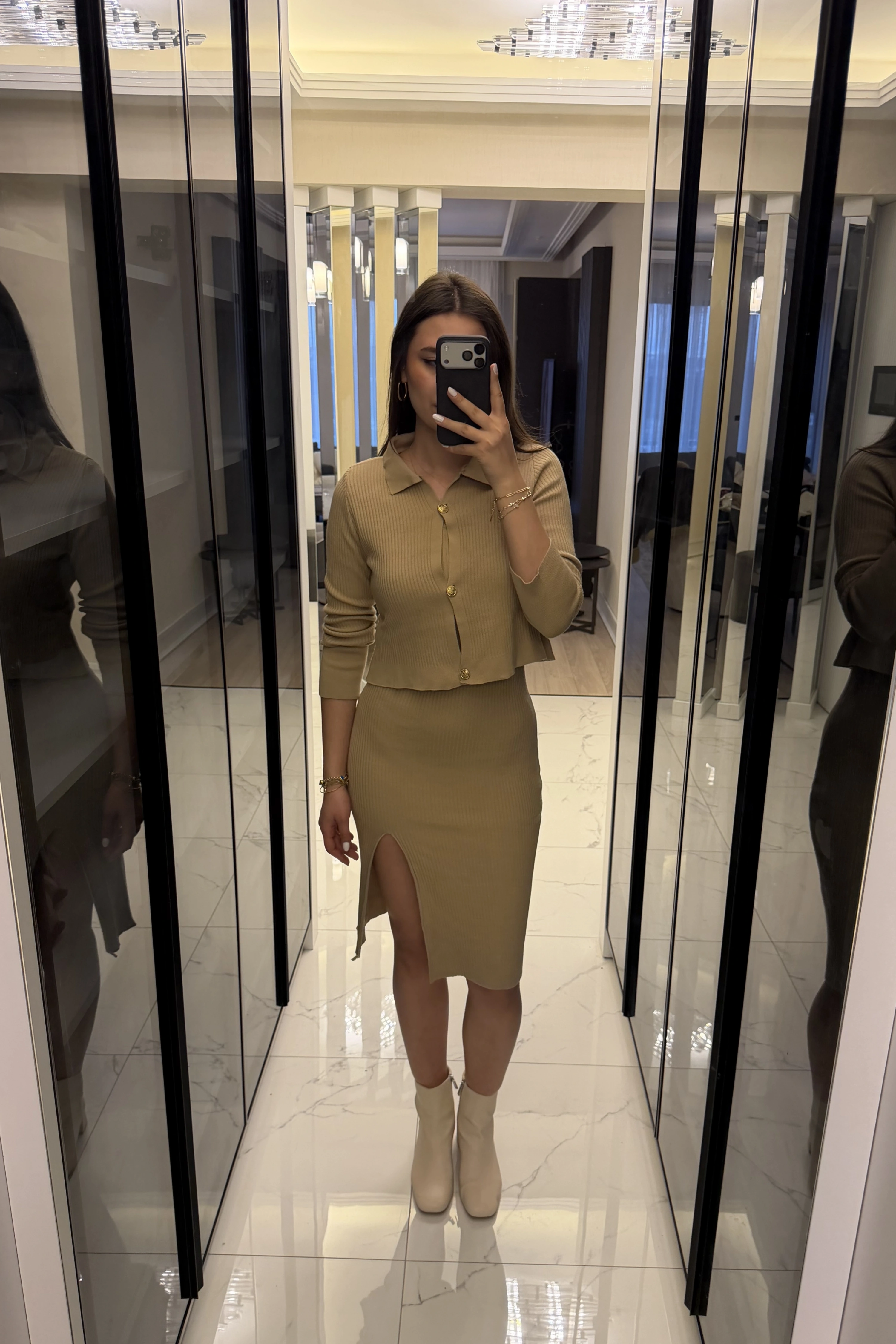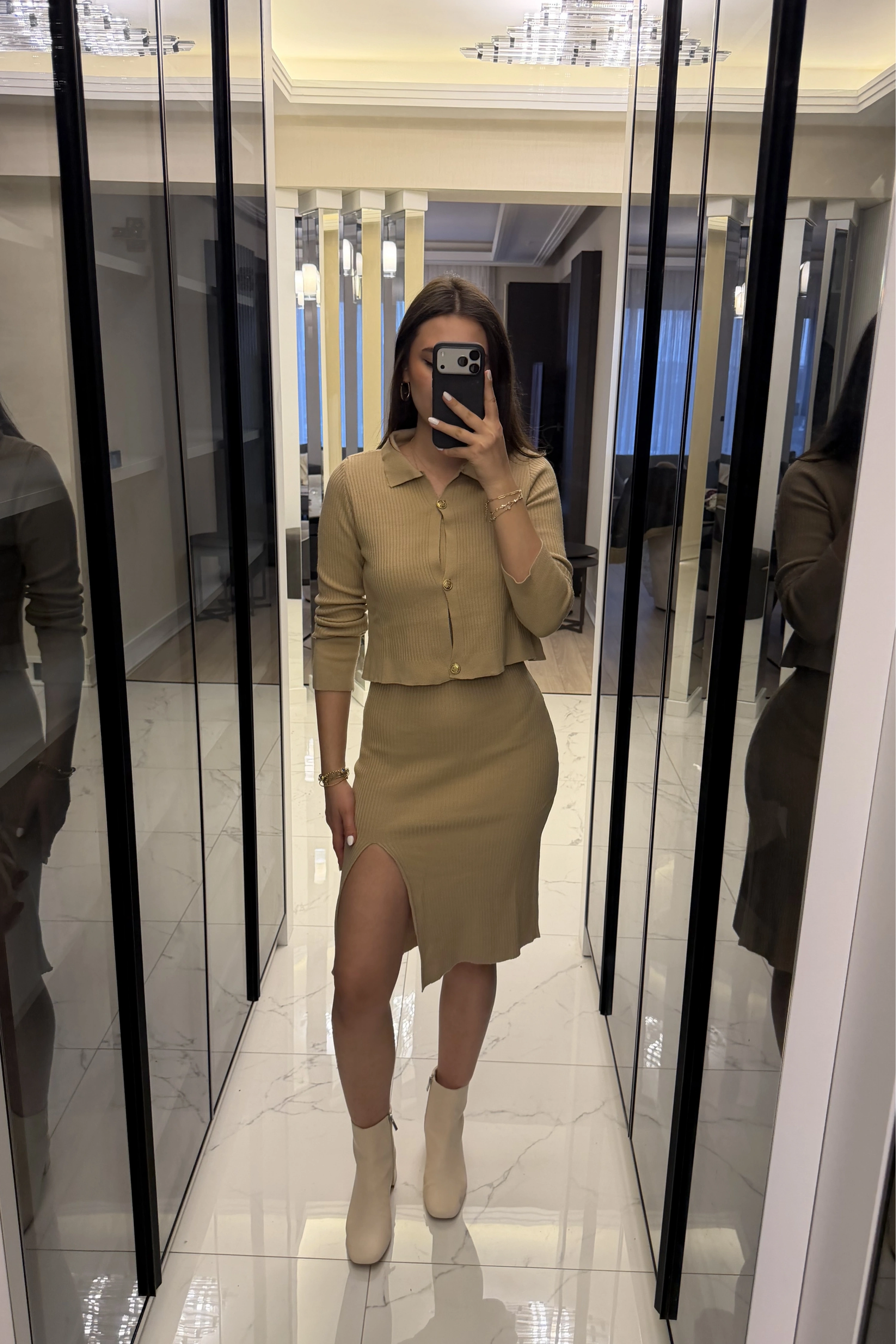 Bej Renly Hırka Elbise Triko Takım