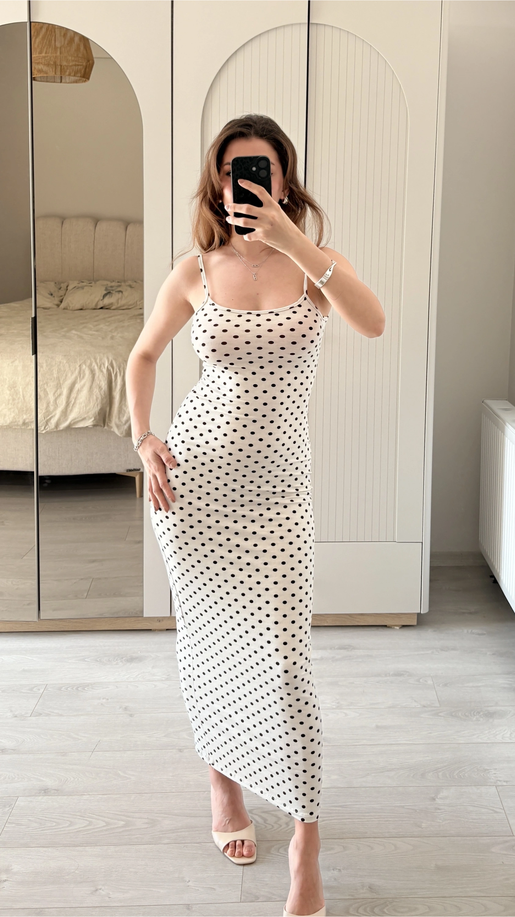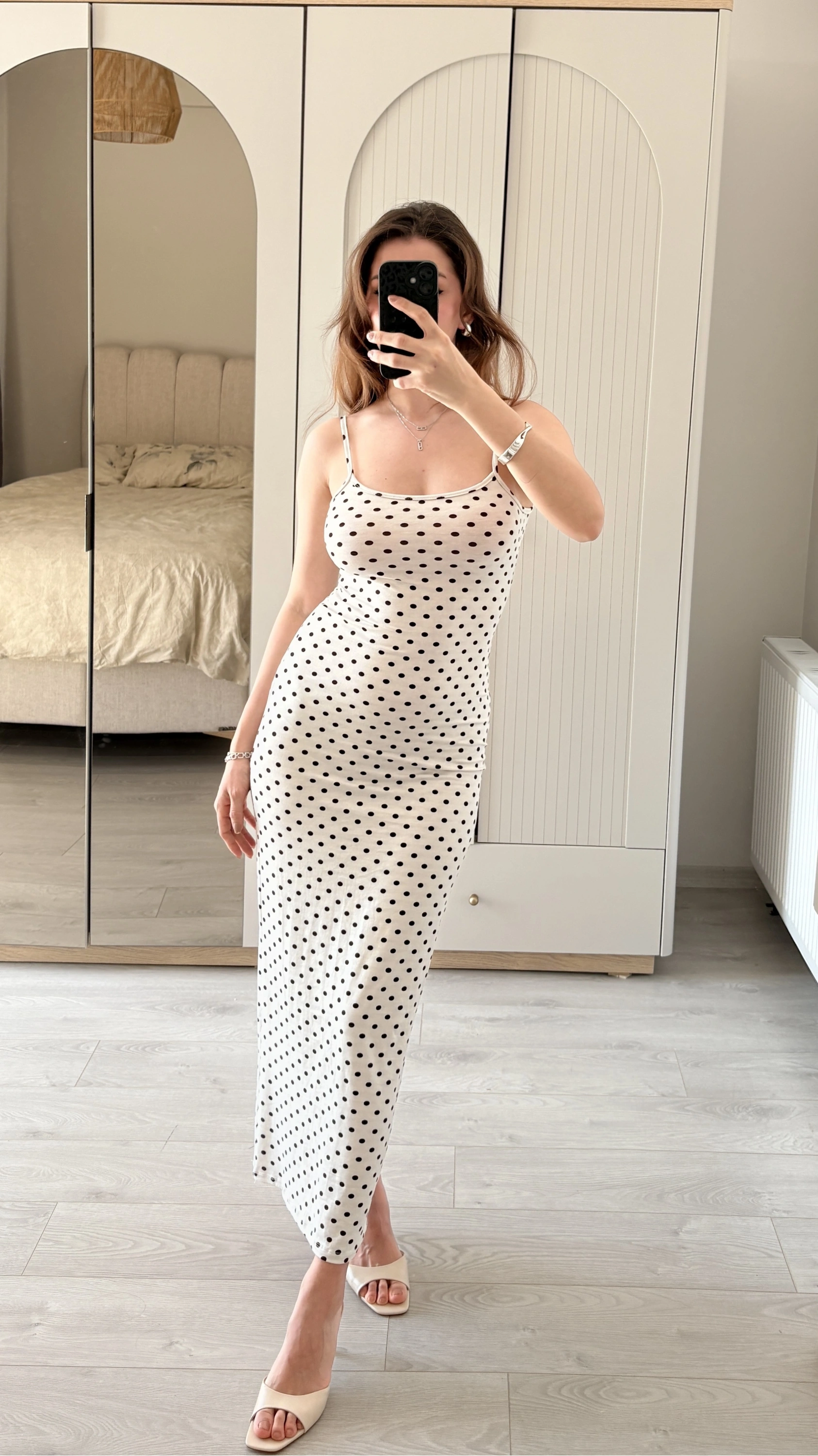 Beyaz Ayarlanabilir İnce Askılı Puantiye Elbise