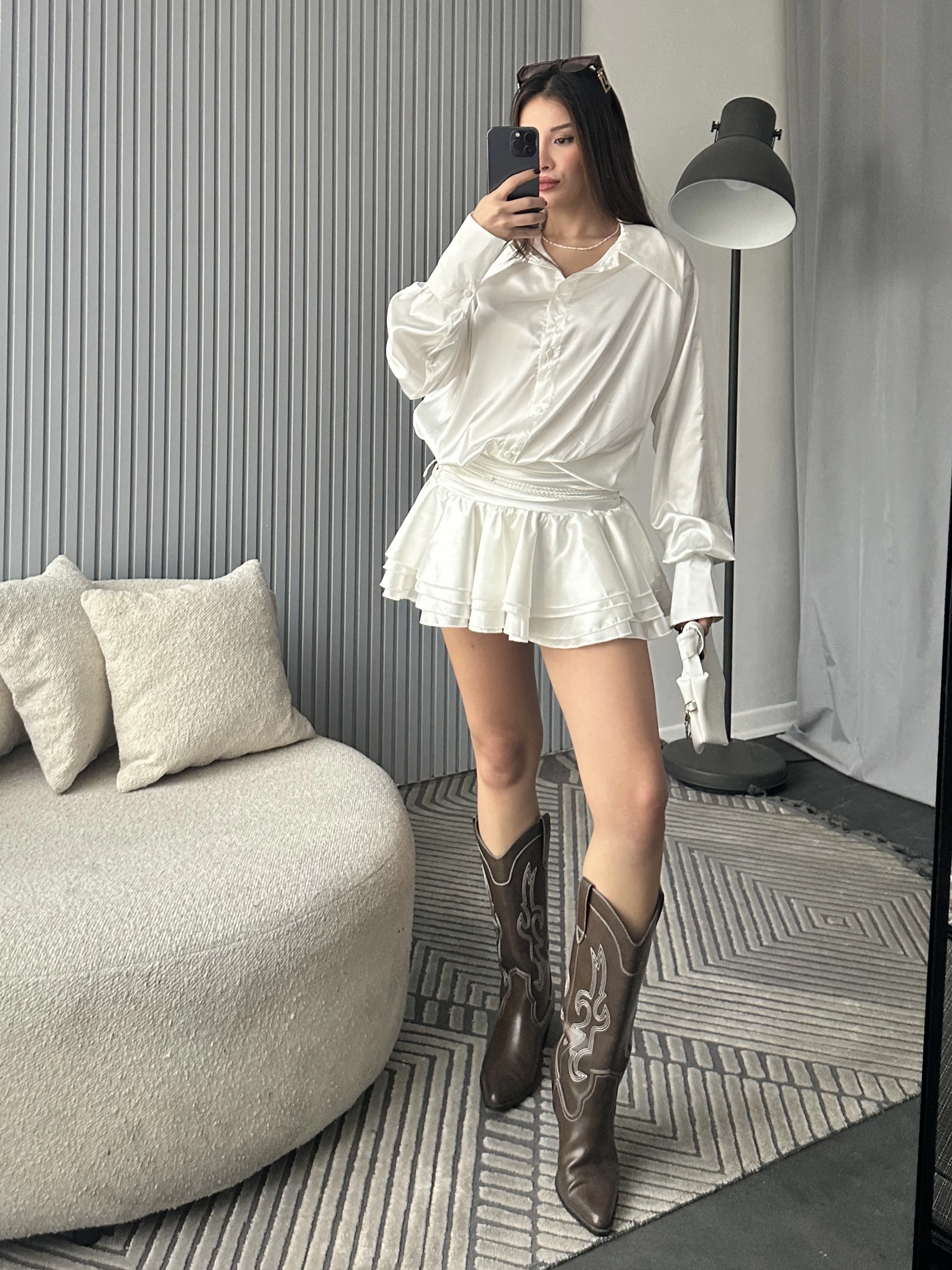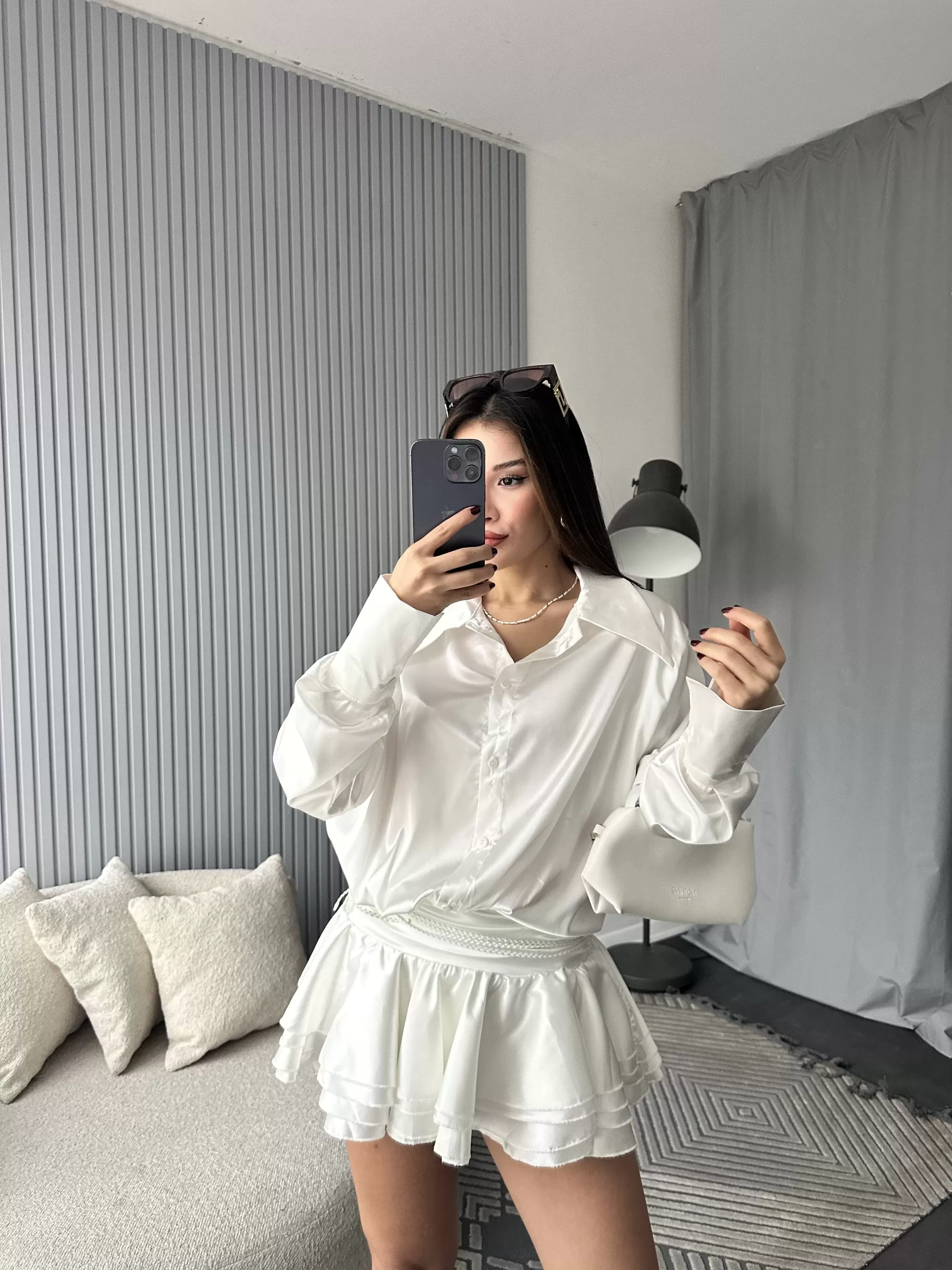 Beyaz Kemerli Fırfır Etek Gömlek Saten Elbise