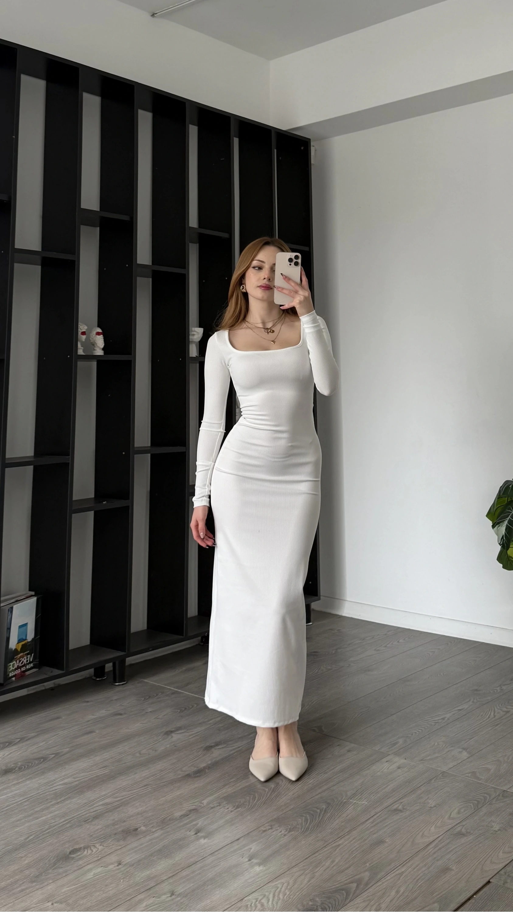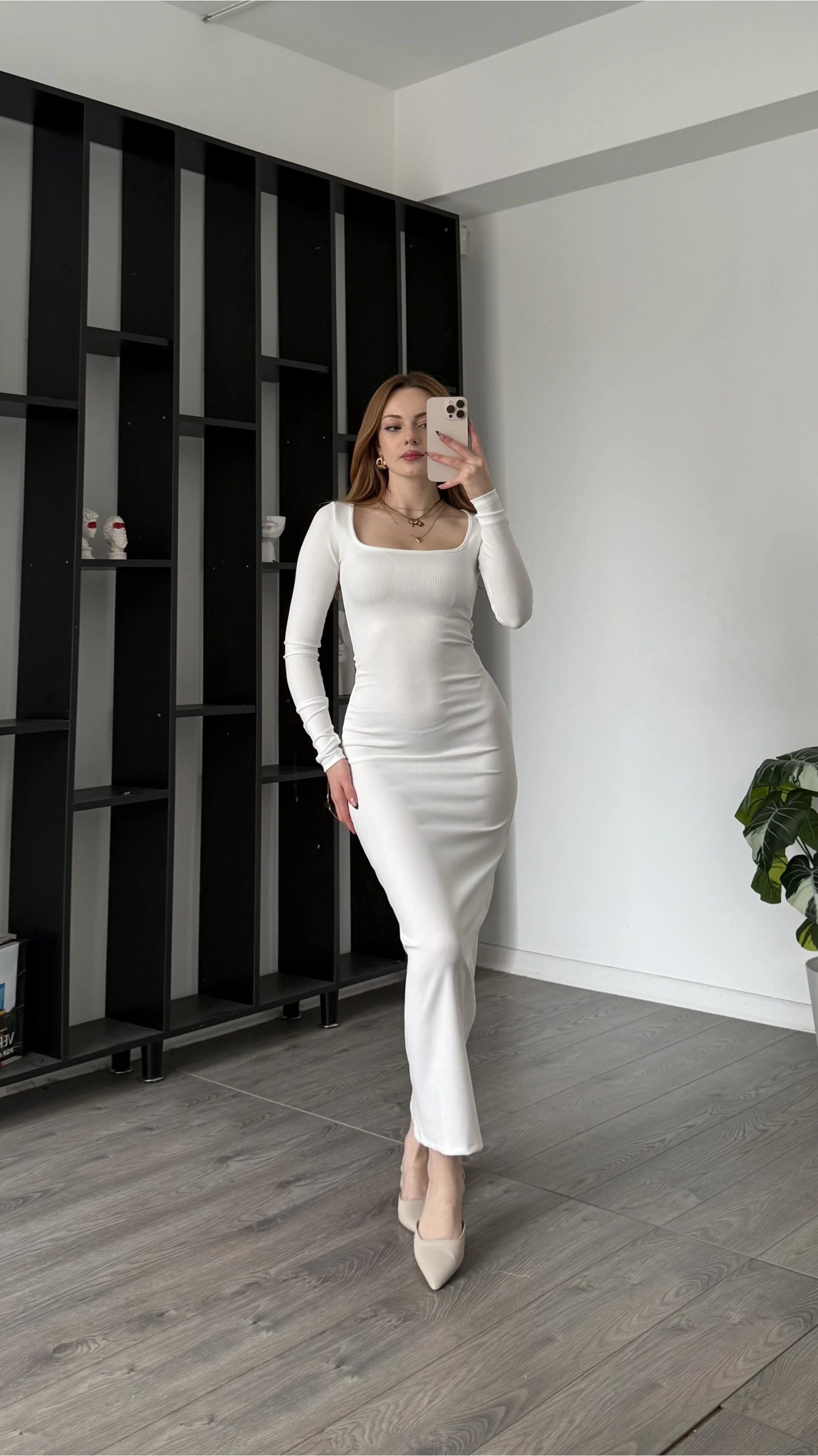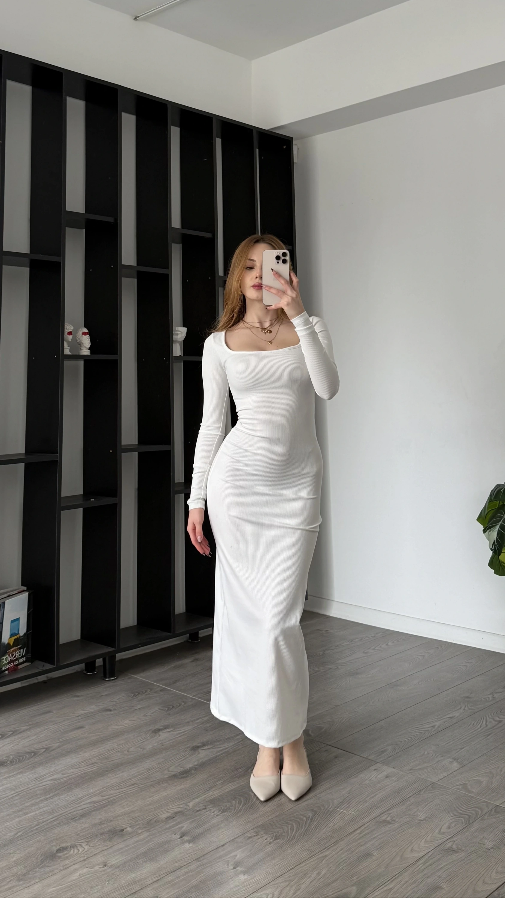 Beyaz Luis Kare Yaka Basic Uzun Elbise