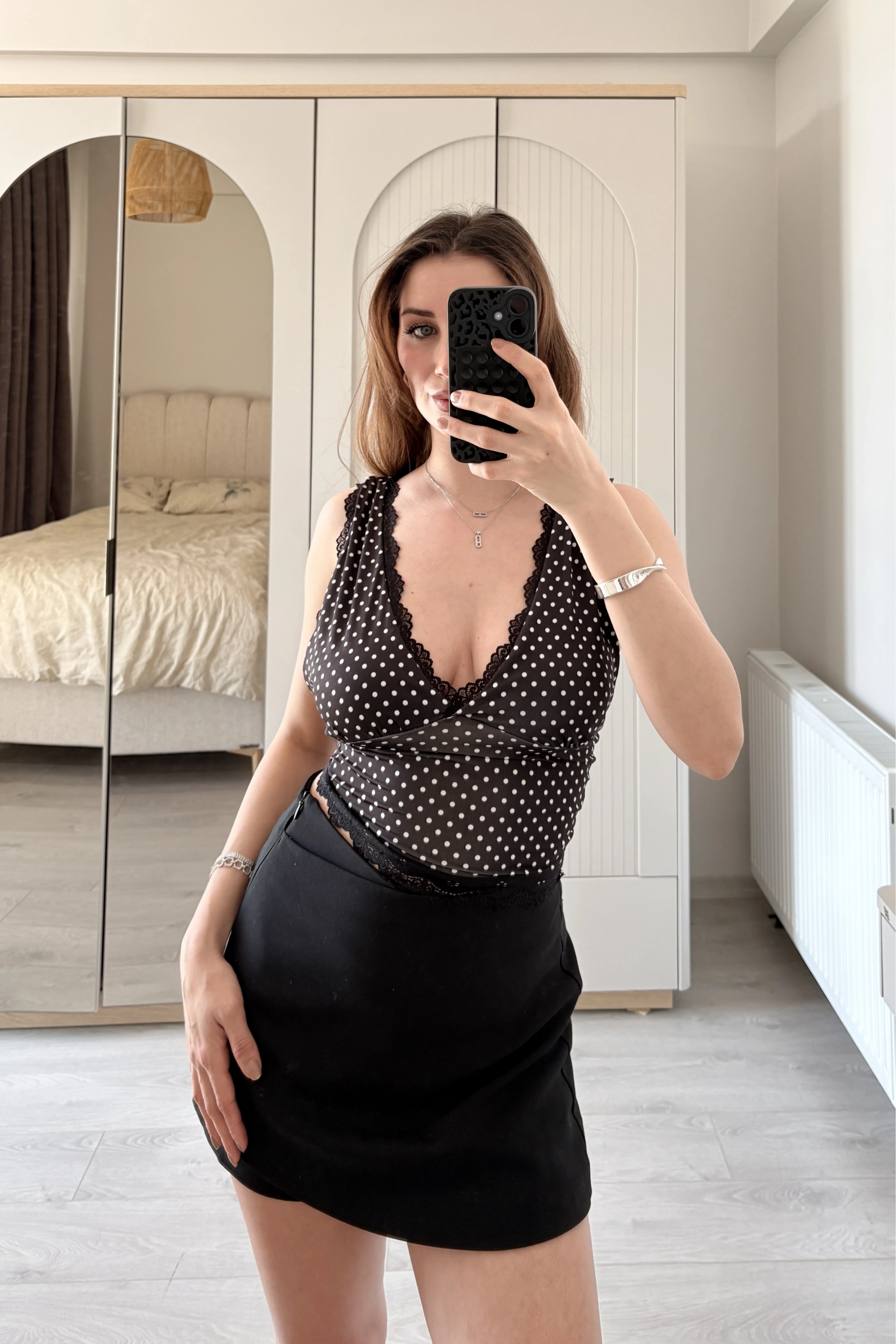 Bonny Siyah Dantel Detay Puantiyeli V Yaka Bluz