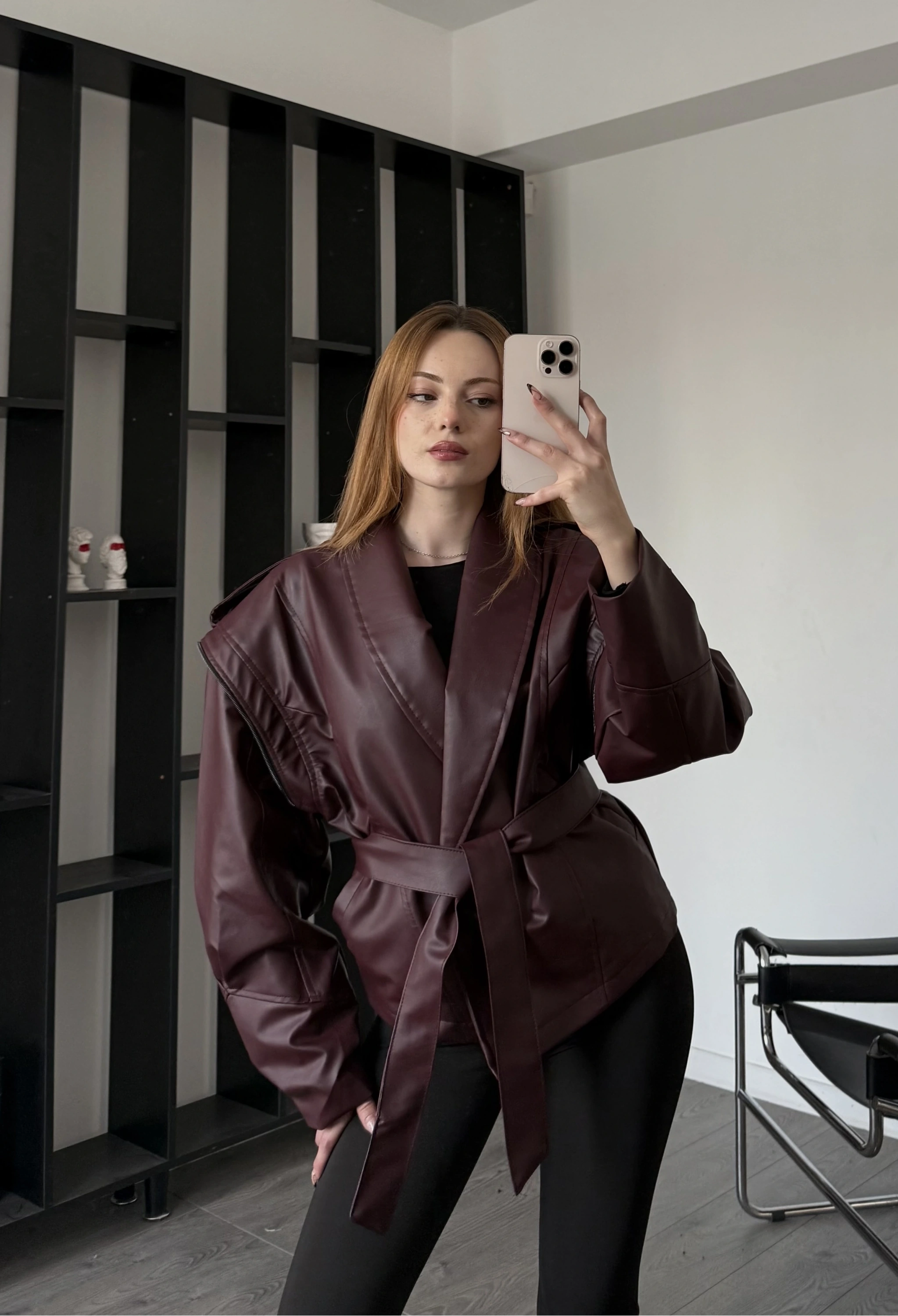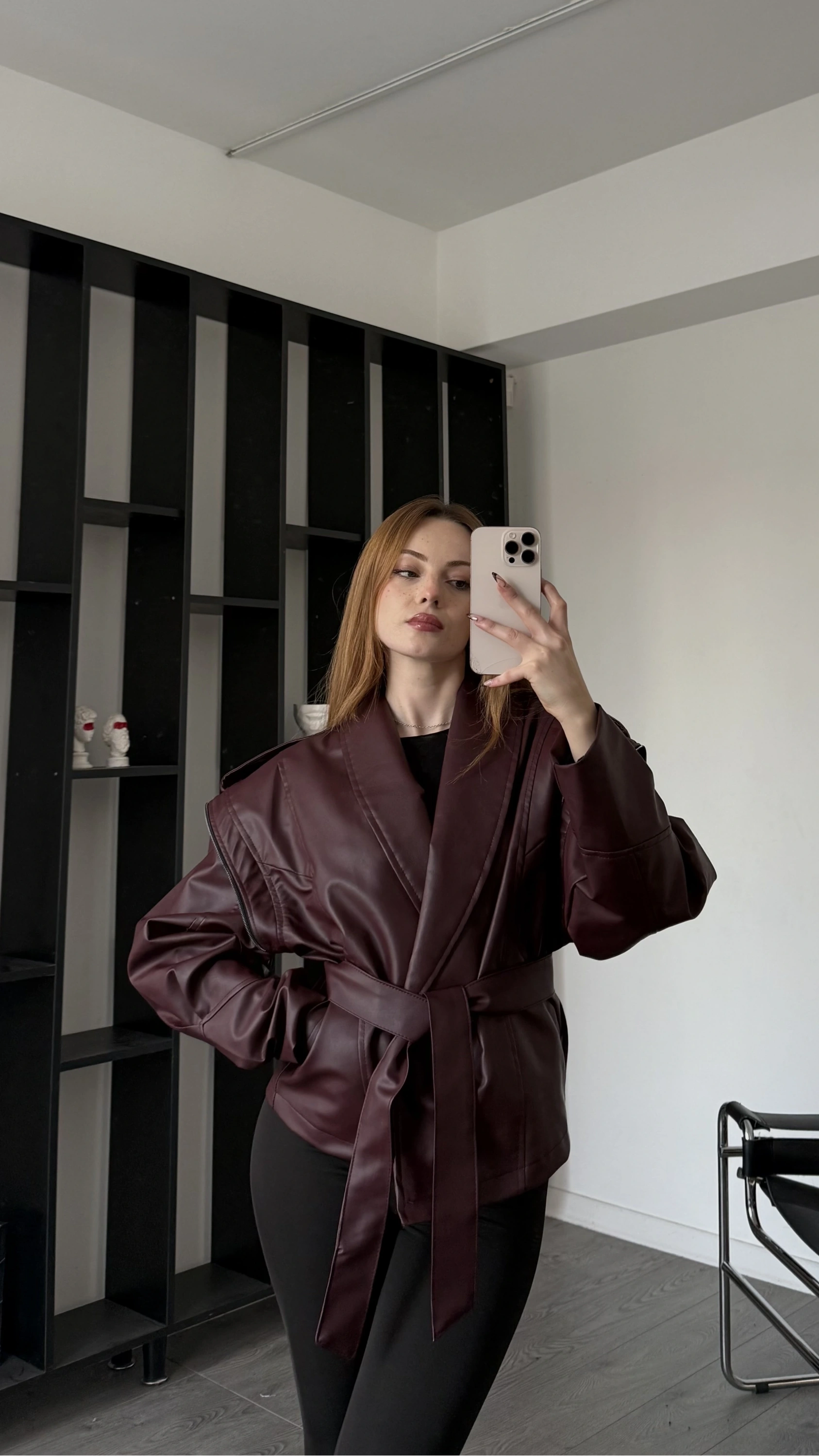 Bordo Anja Tasarım Kuşaklı Deri Ceket