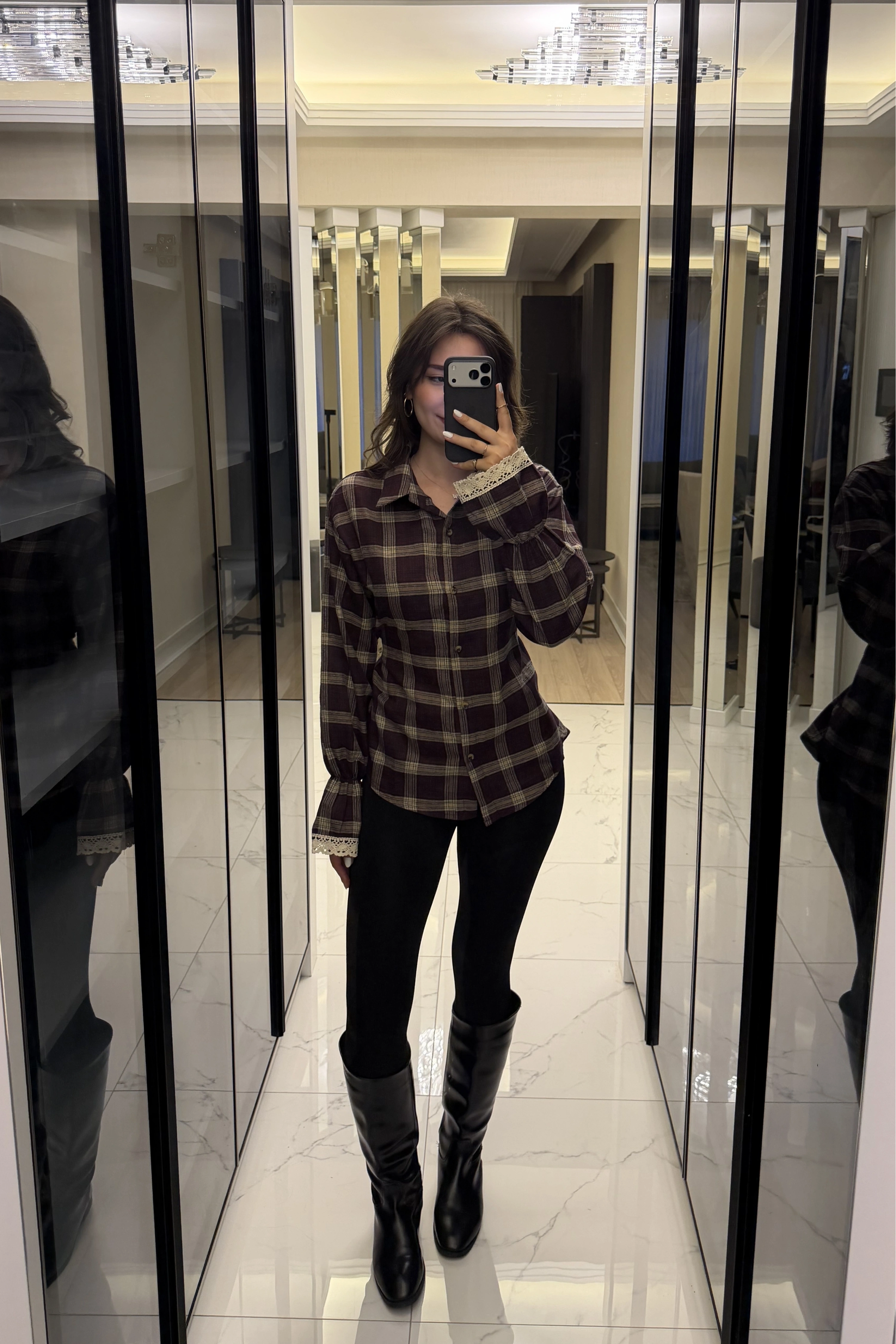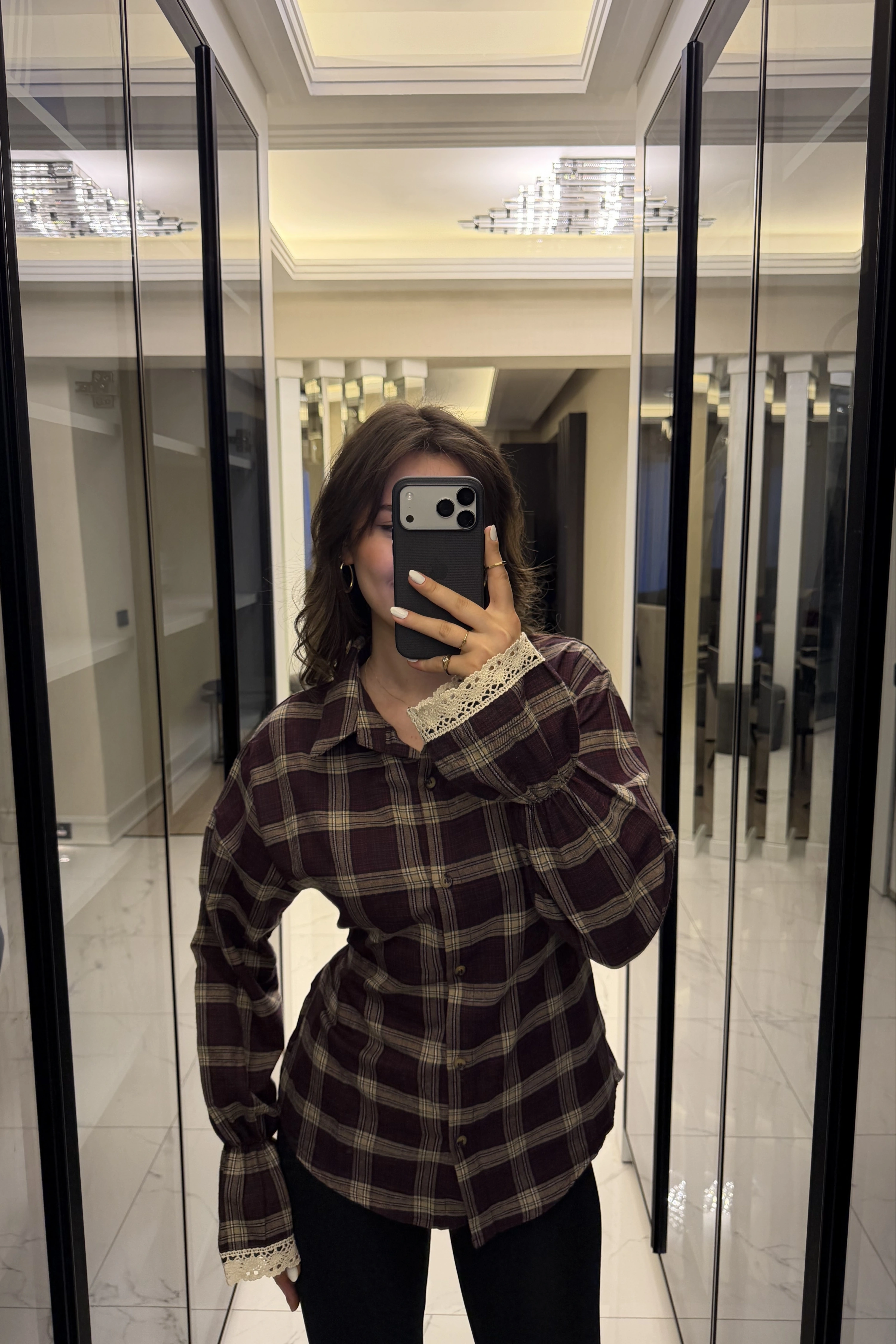 Bordo Güpür Detaylı Belden Bağcıklı Ekose Gömlek