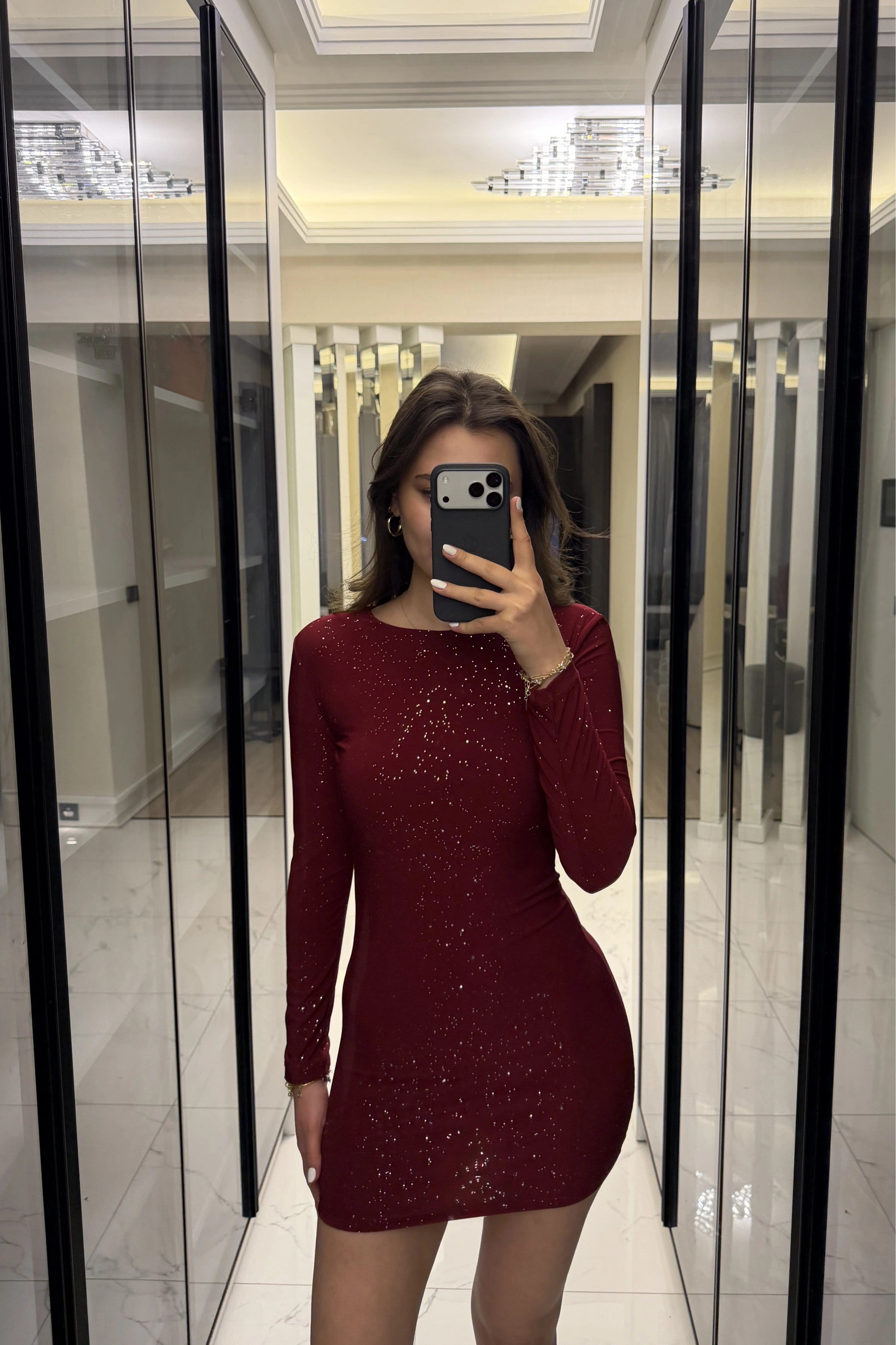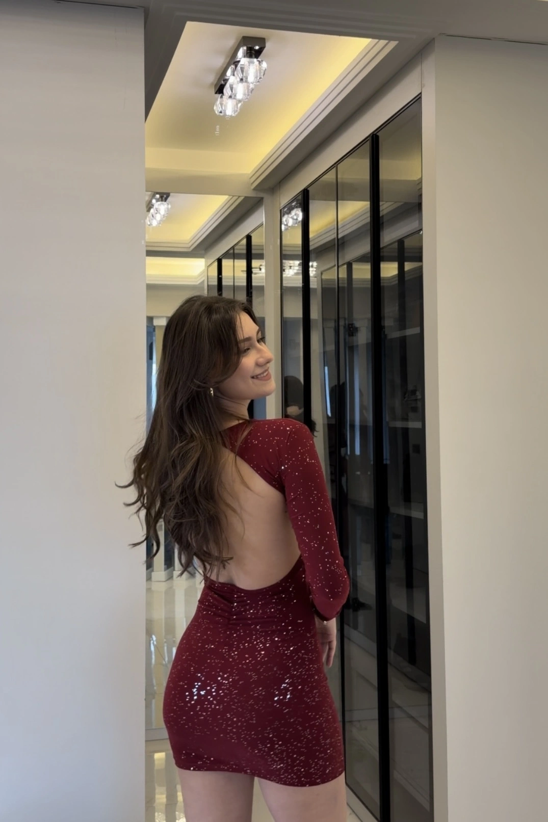 Bordo Işıltılı Sırt Dekolteli Mini Elbise