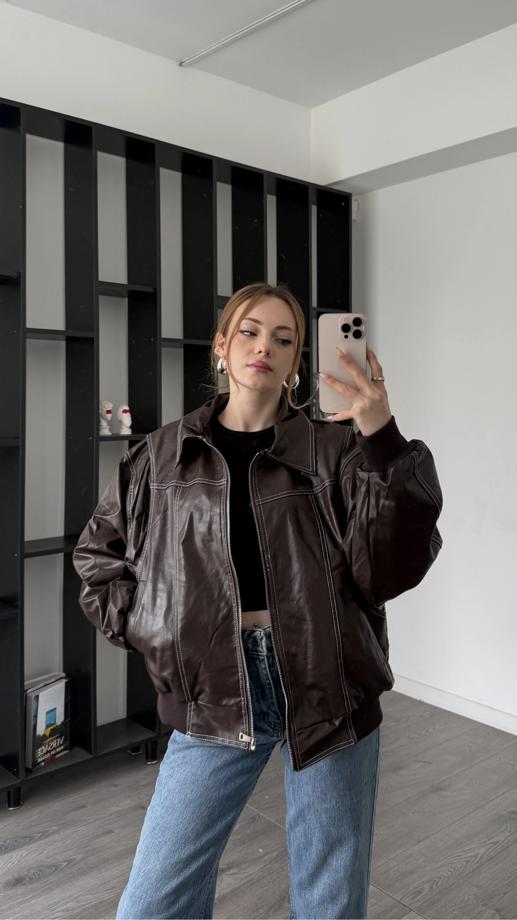Kahve Amy Dikiş Detaylı Oversize Deri Ceket