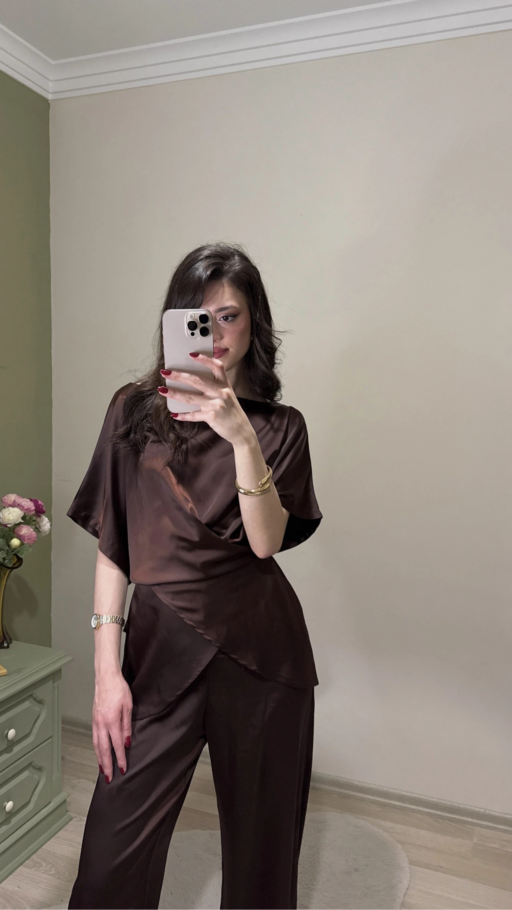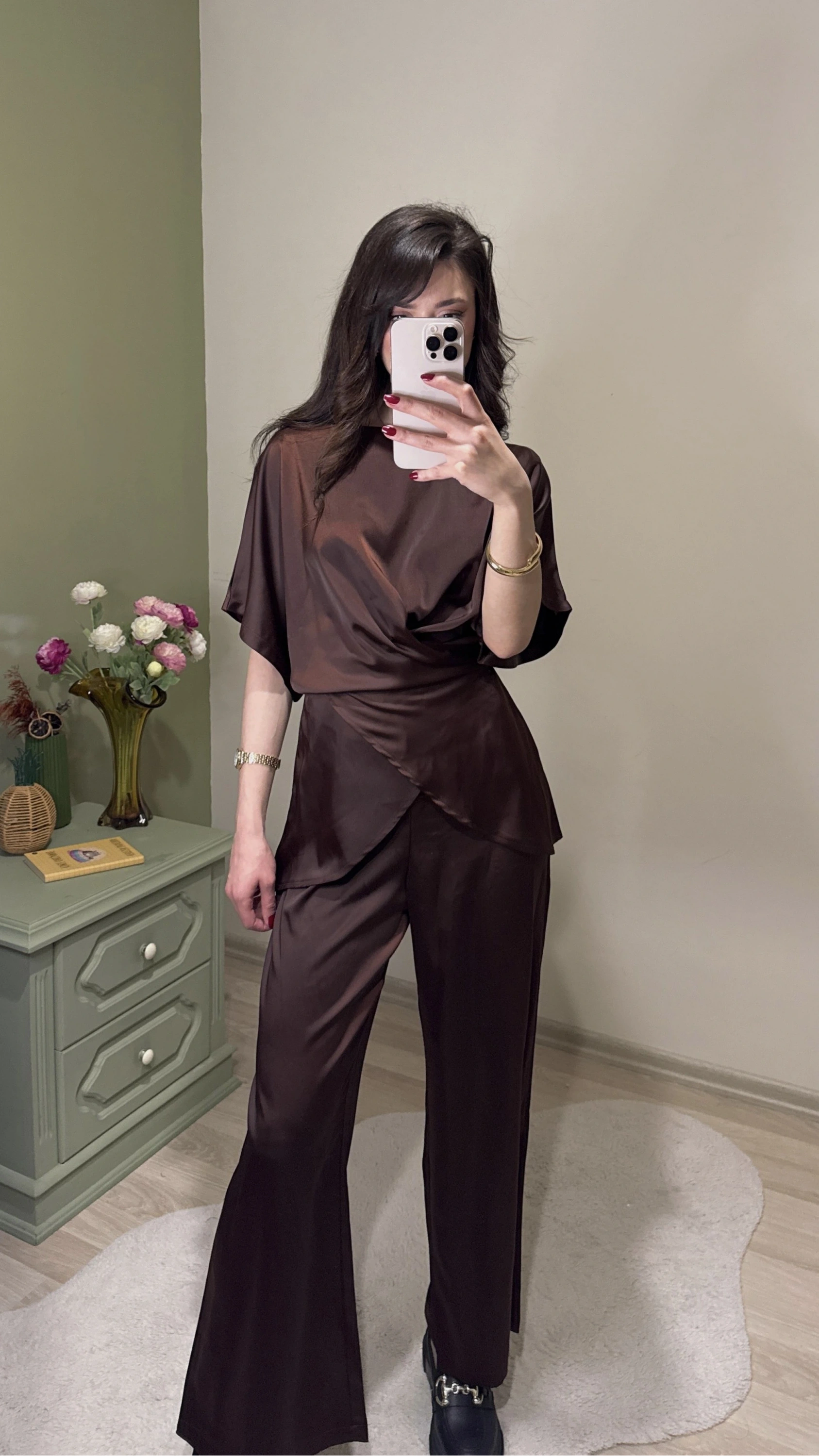 Kahve Aura Bağcıklı Saten Takım