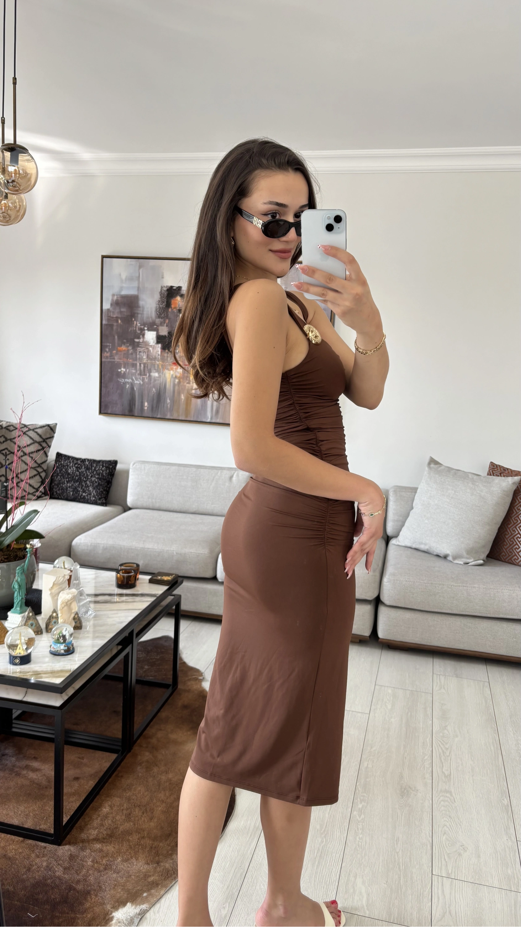 Kahve Deniz Kabuğu Broşlu Drapeli Kalem Elbise