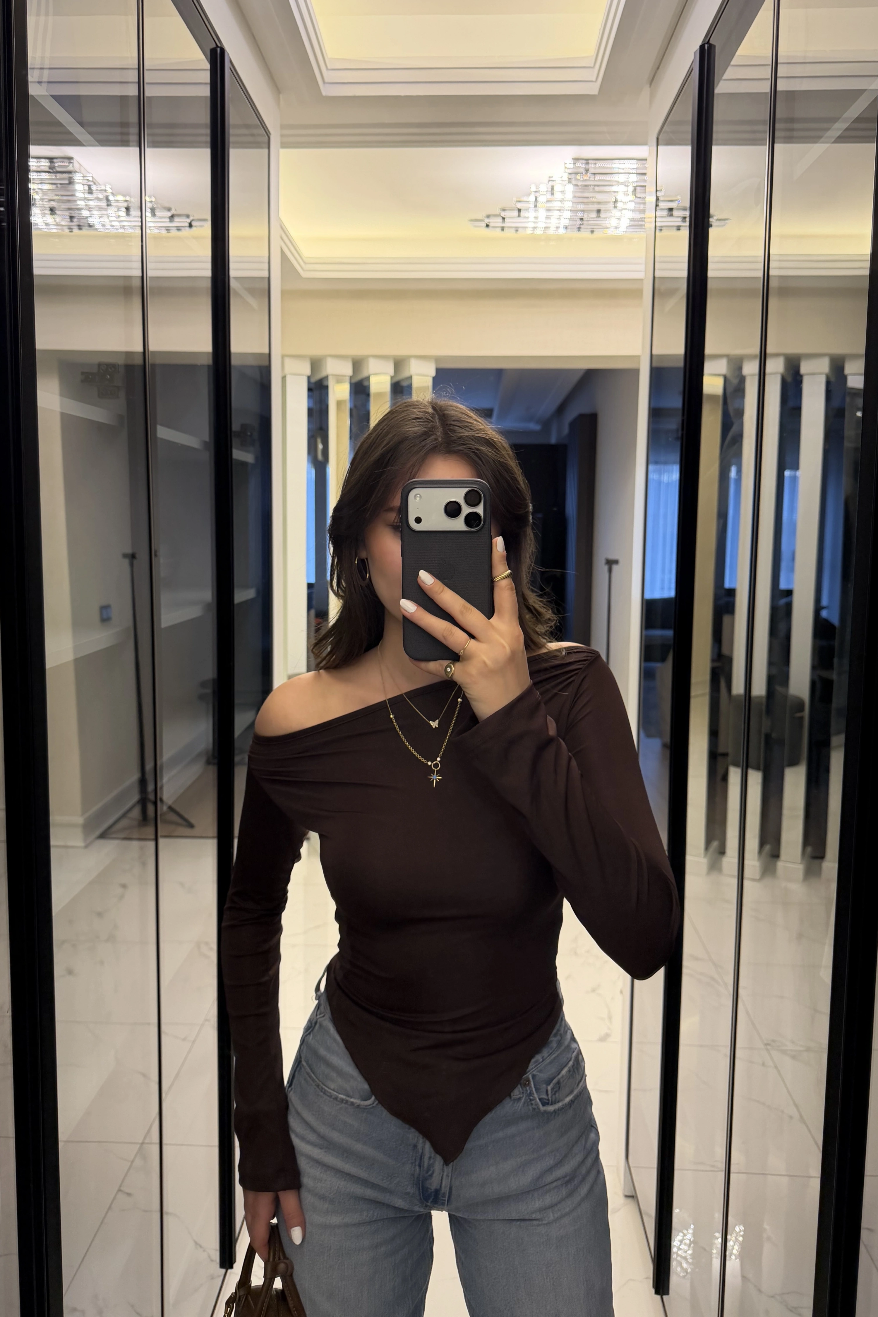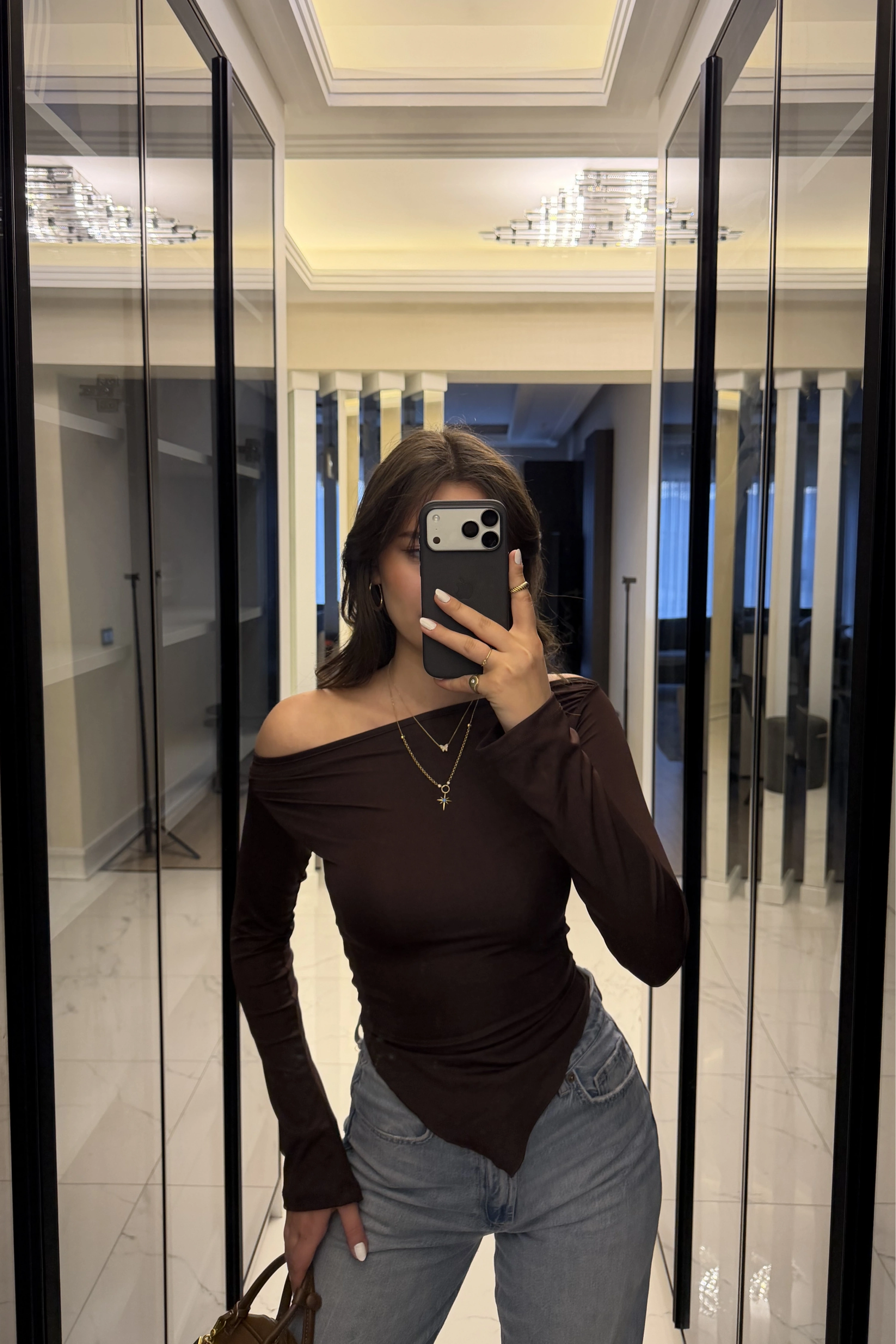 Kahve Hailey Kayık Yaka Asimetrik Kesim Bluz