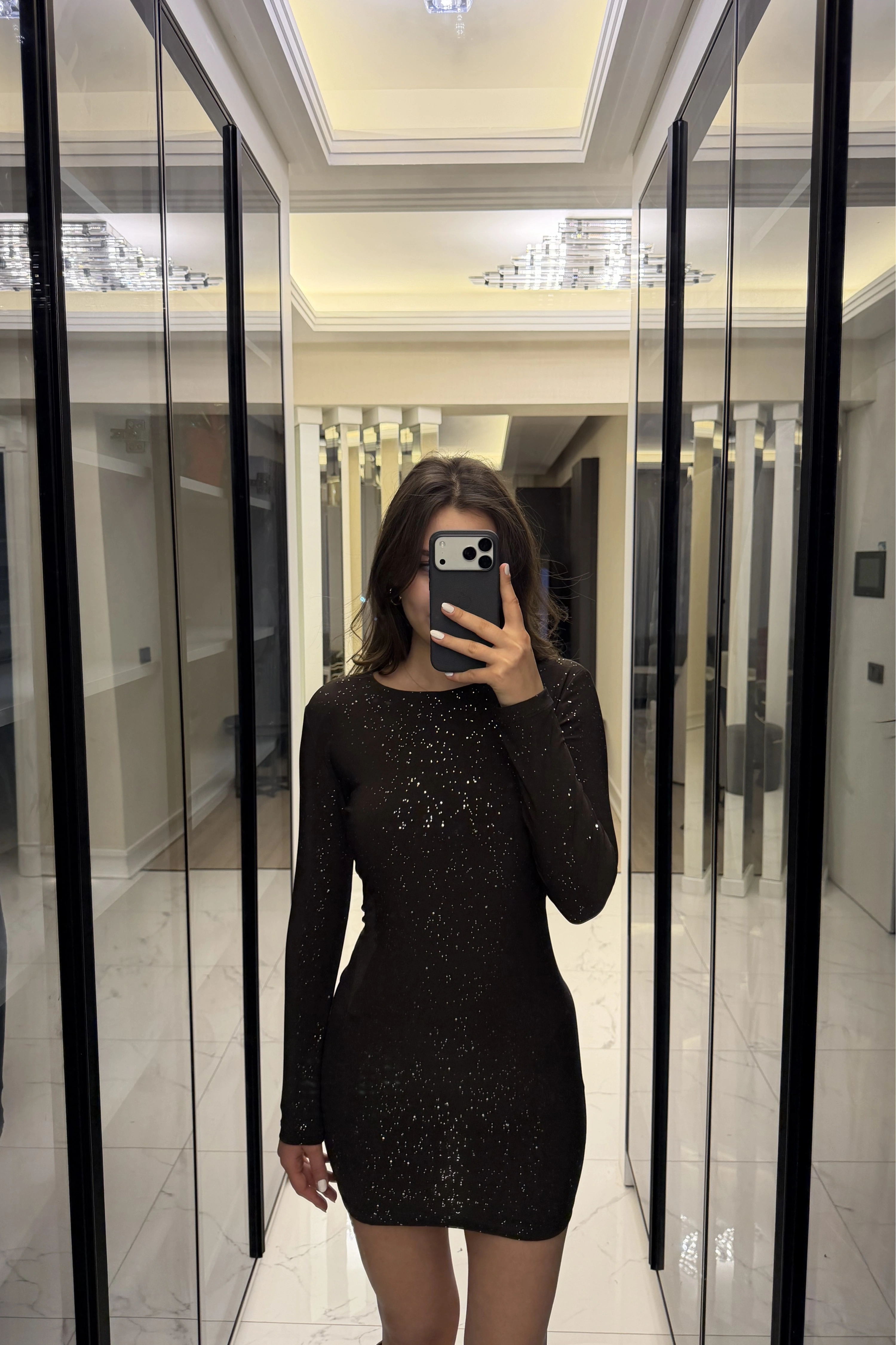 Kahve Işıltılı Sırt Dekolteli Mini Elbise