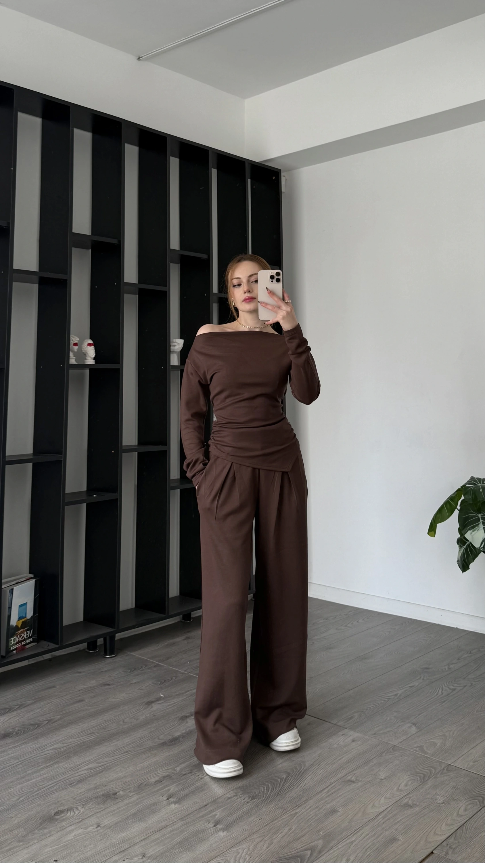 Kahve Lumi Asimetirk Kayık Yaka Modal Takım