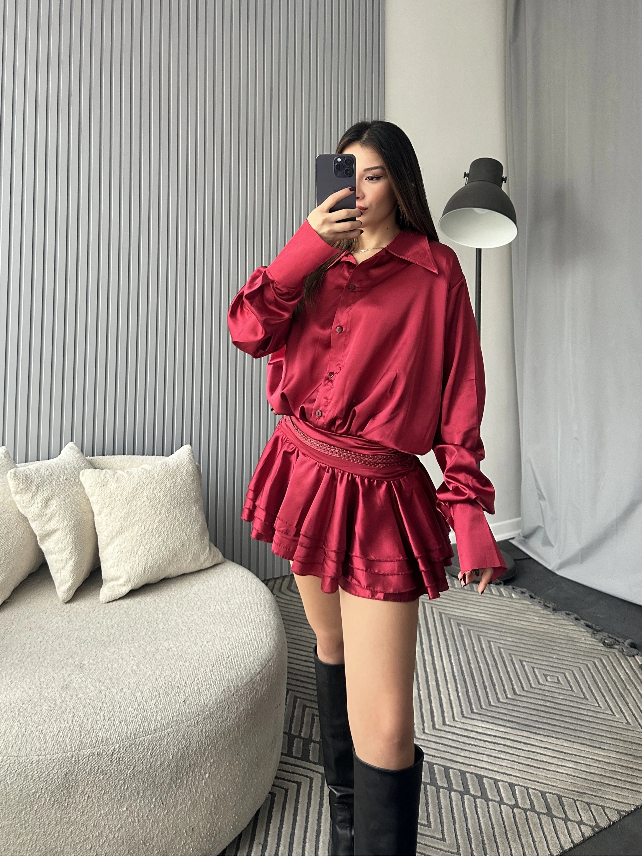 Kırmızı Kemerli Fırfır Etek Gömlek Saten Elbise