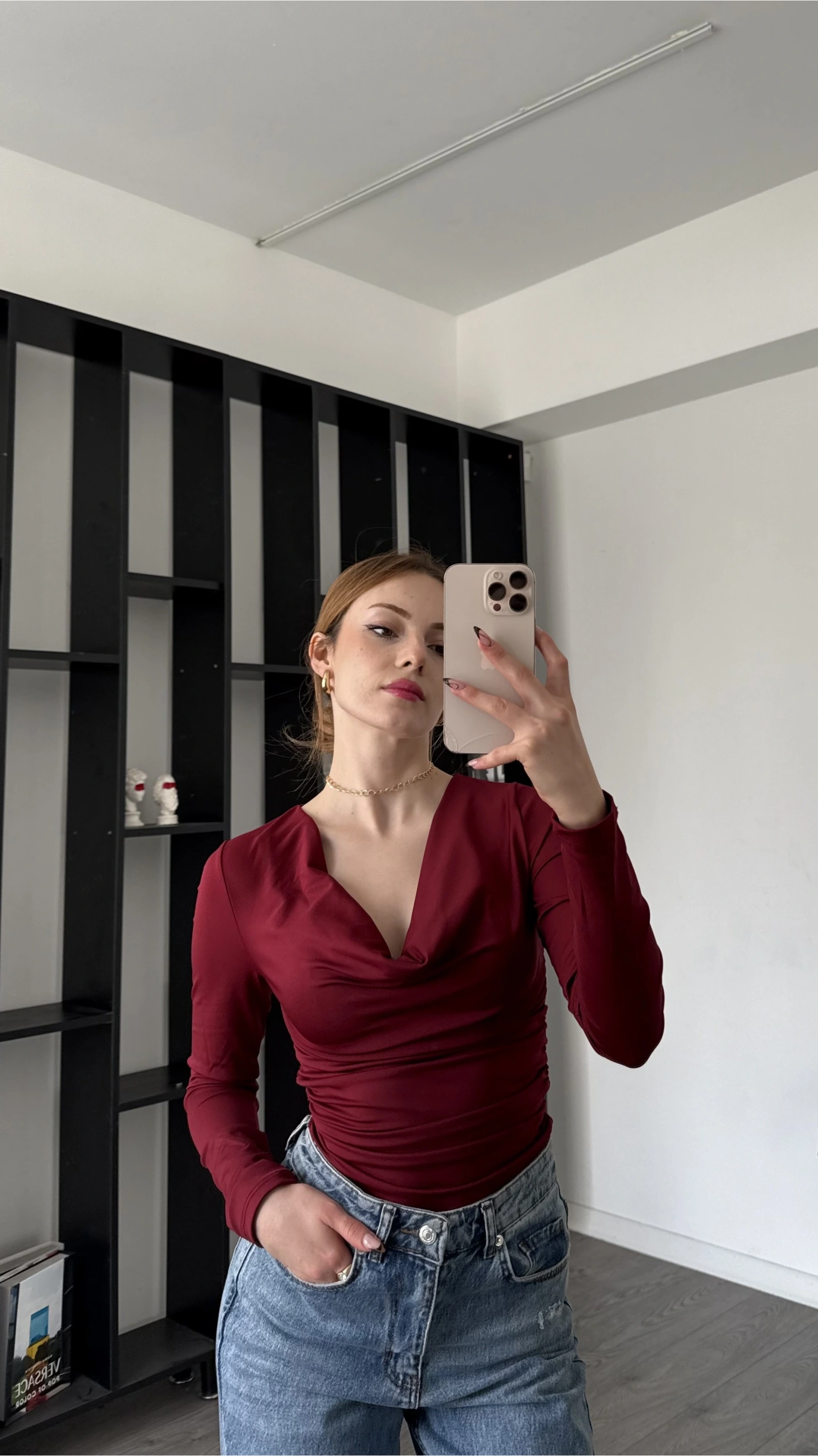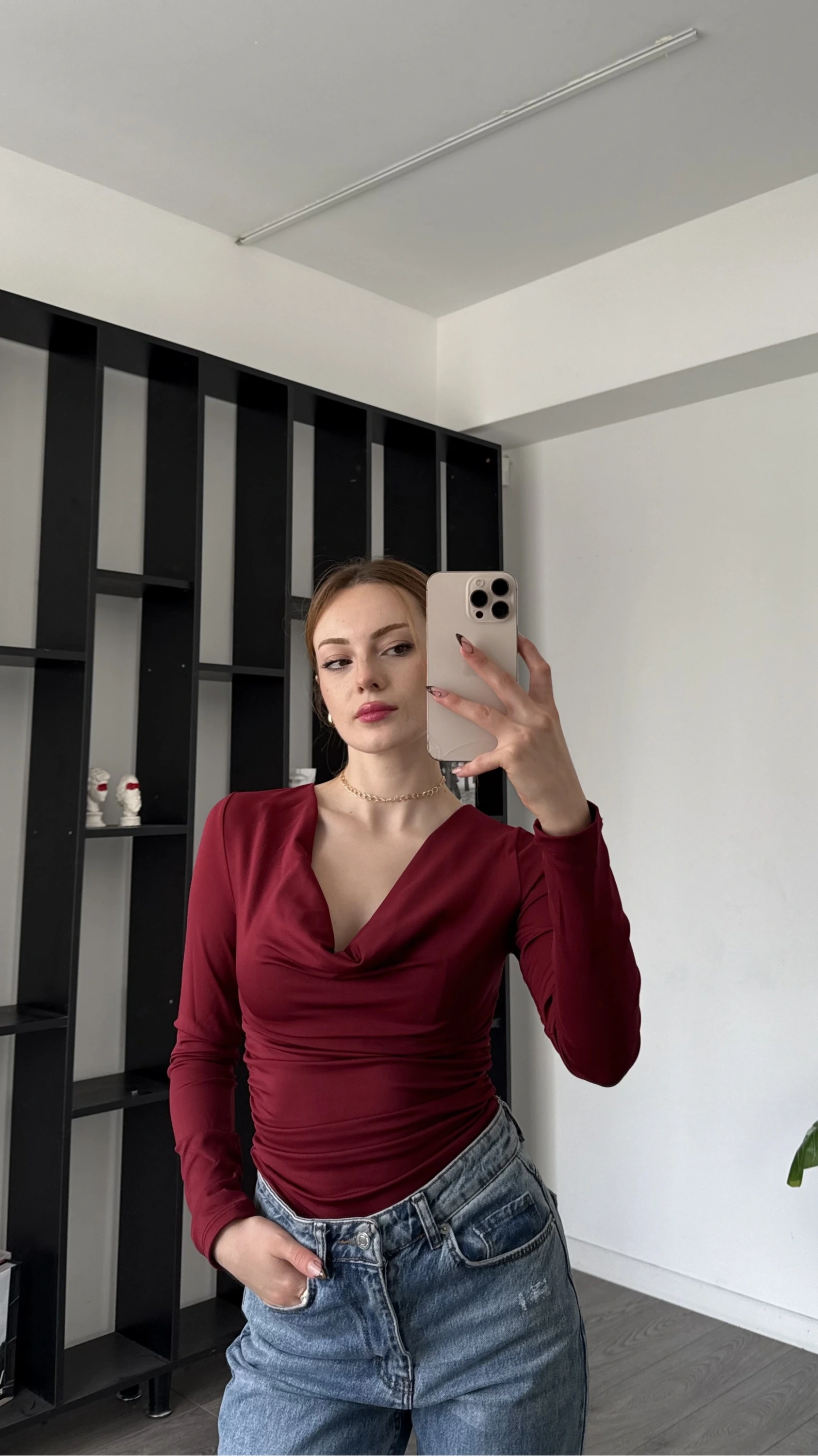 Kırmızı Mendy Degaje Yaka Büzgülü Bluz