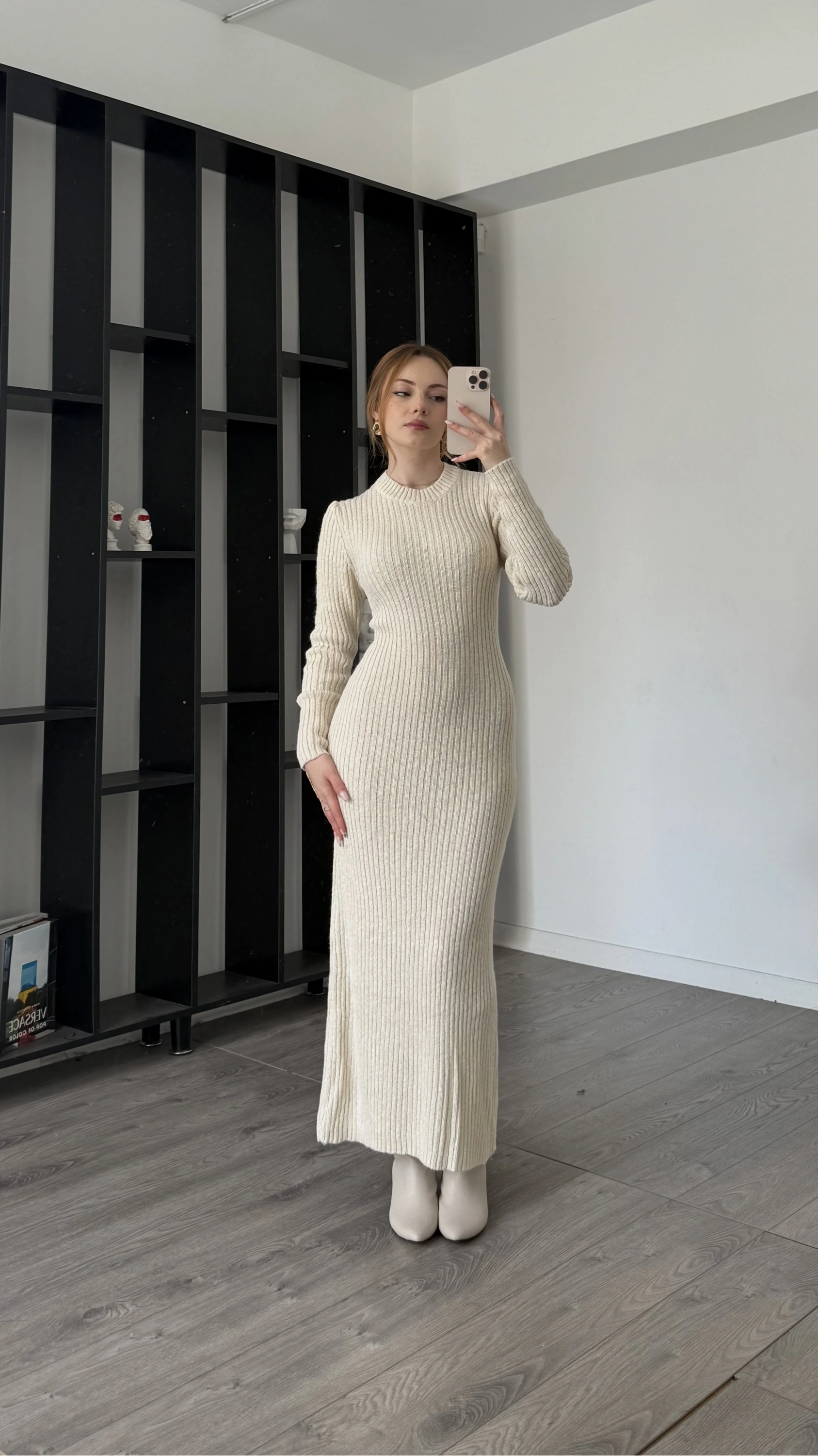 Ekru Bağcık Sırt Dekolteli Triko Elbise