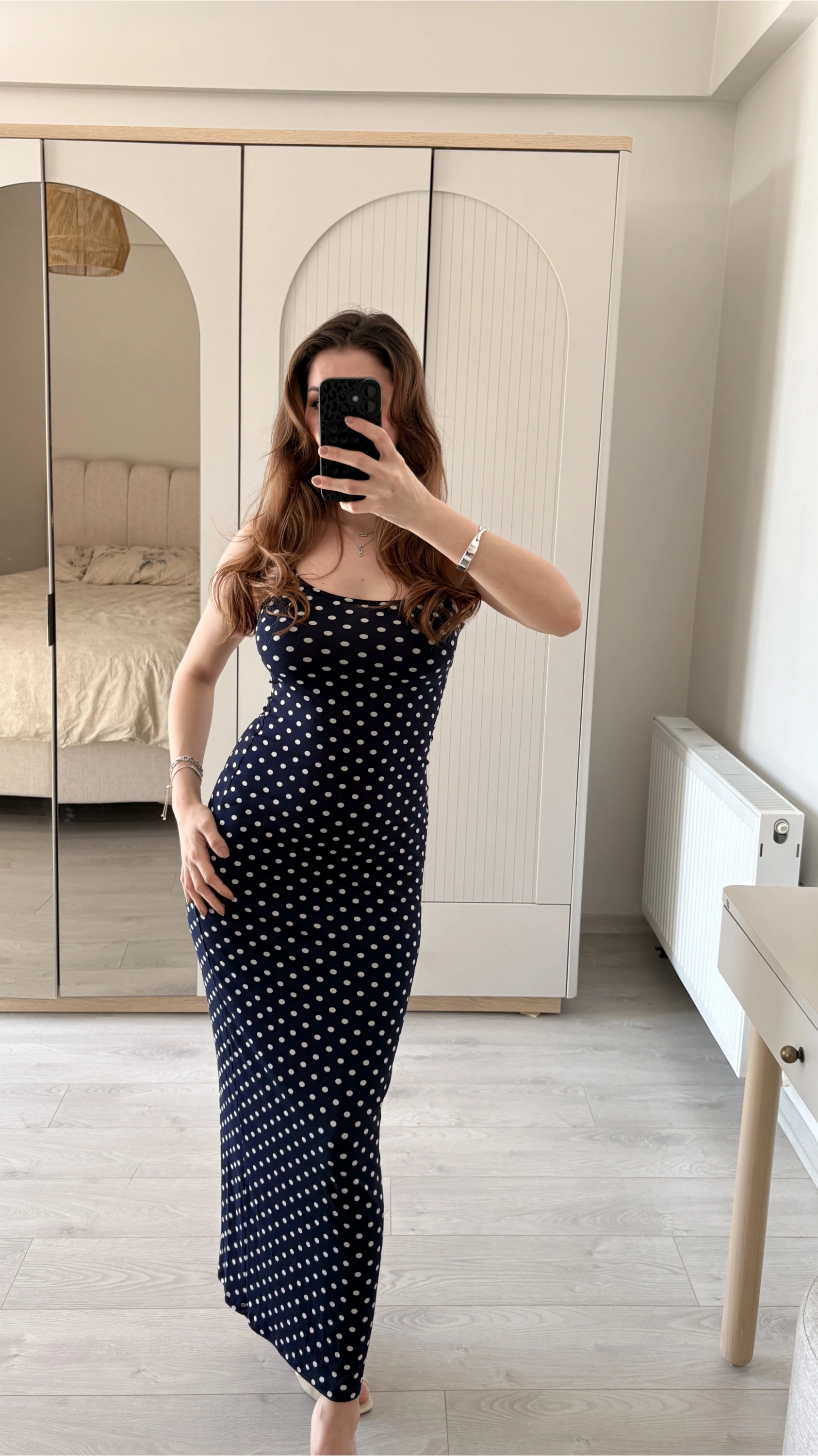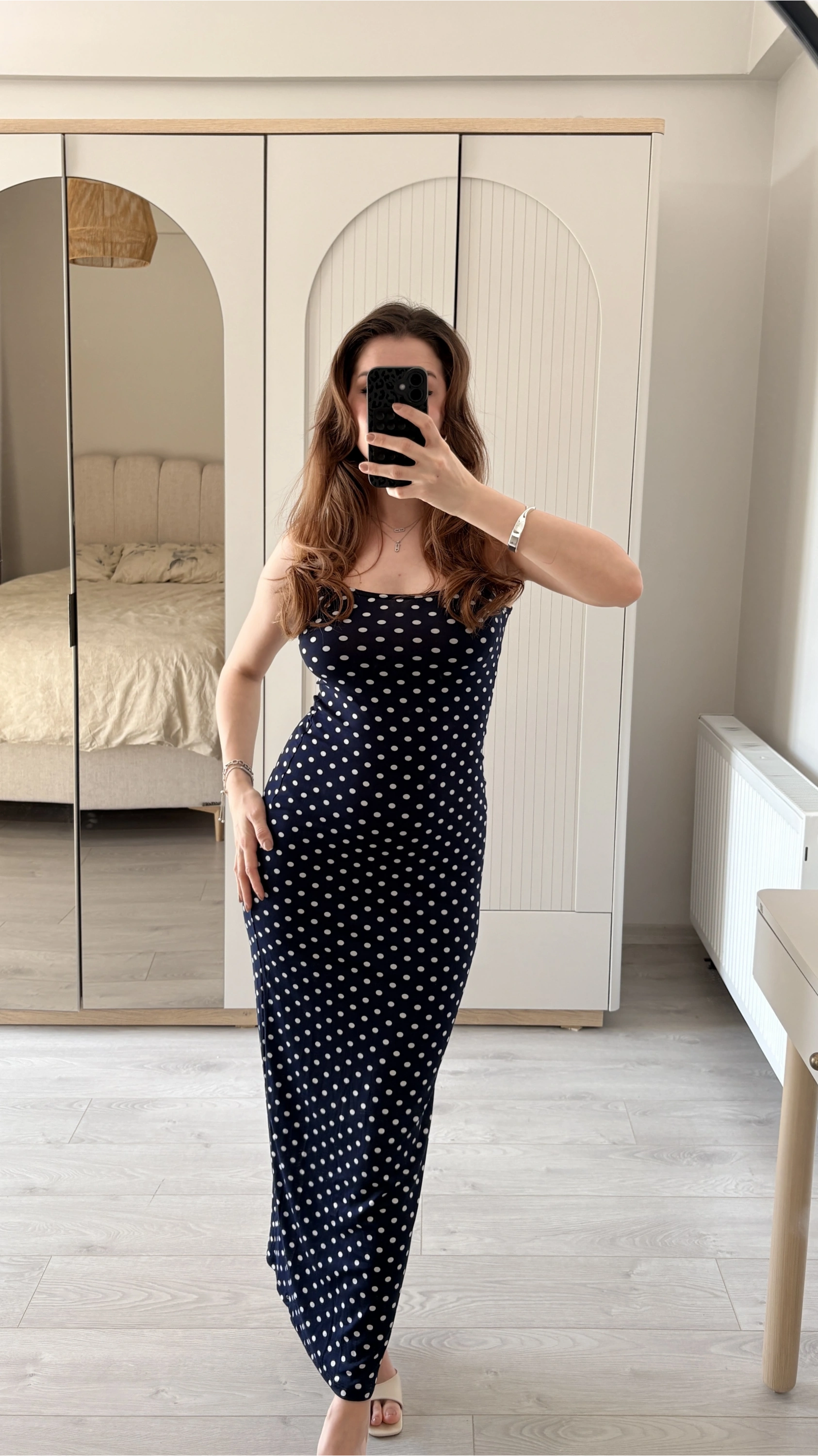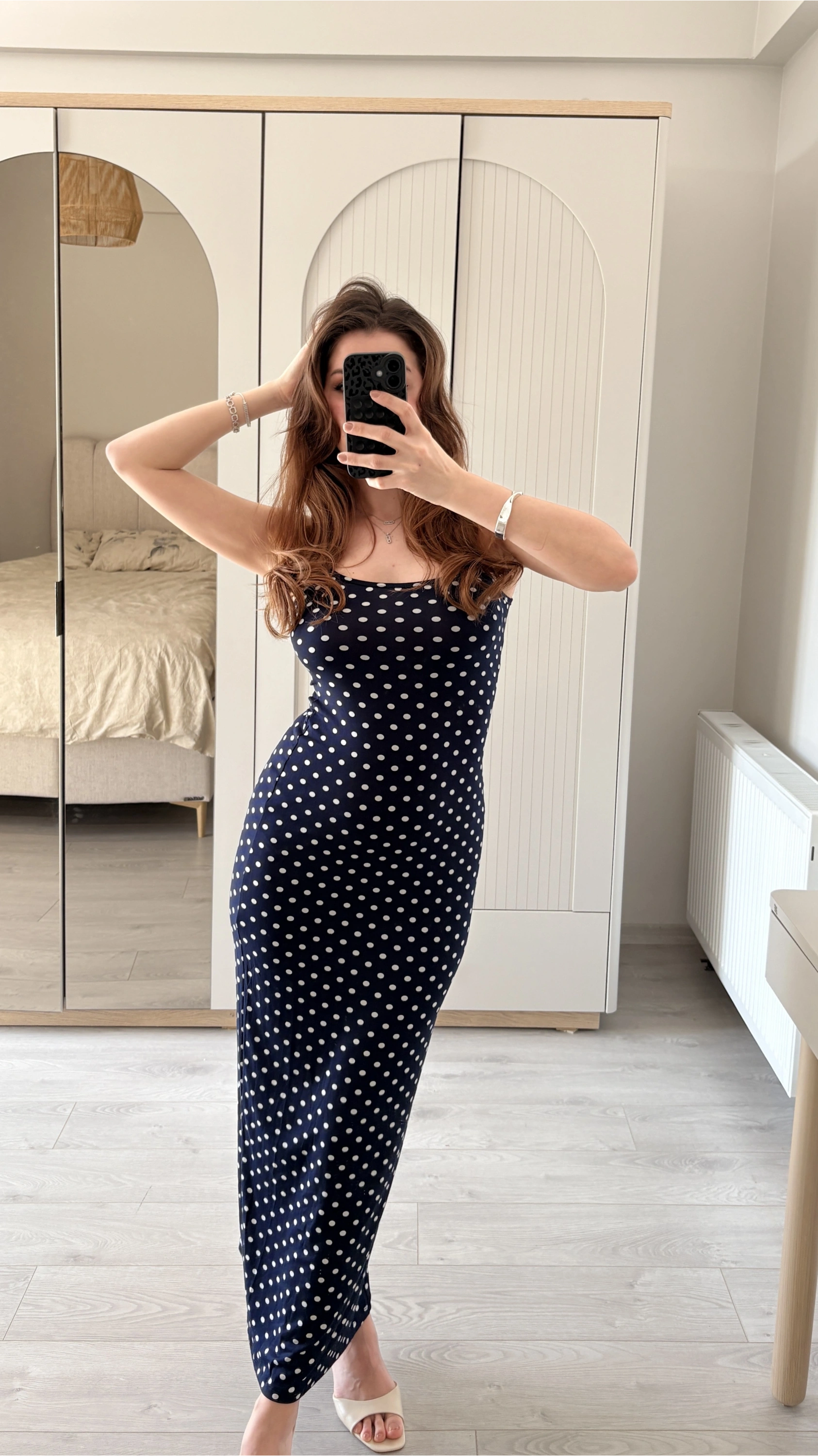 Lacivert Ayarlanabilir İnce Askılı Puantiye Elbise
