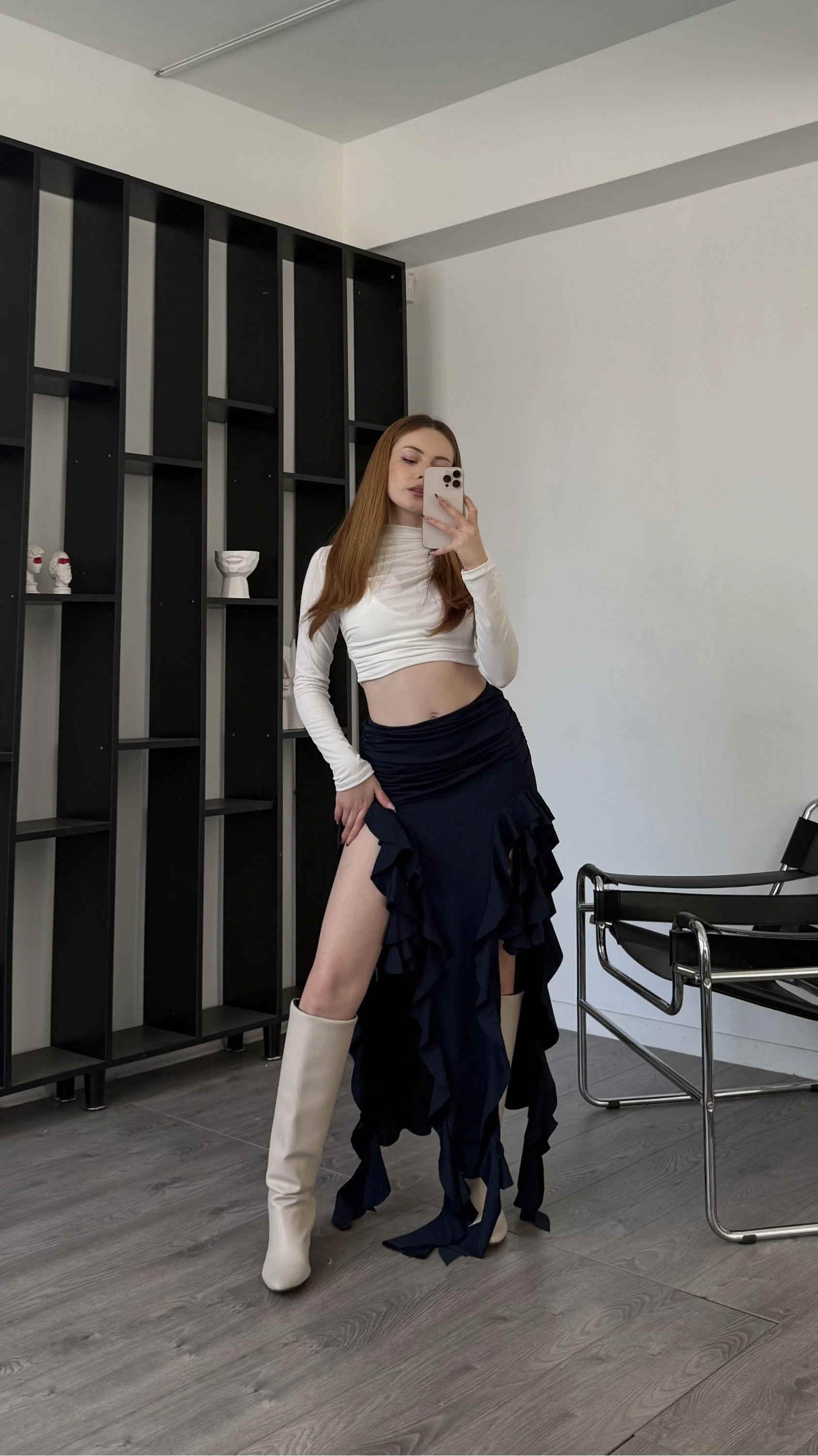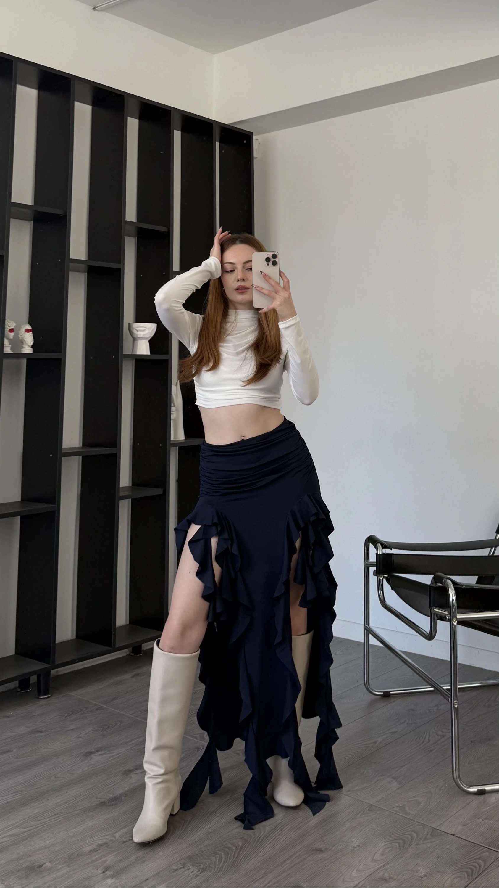 Lacivert Pinna Tasarım Fırfır Yırtmaçlı Etek