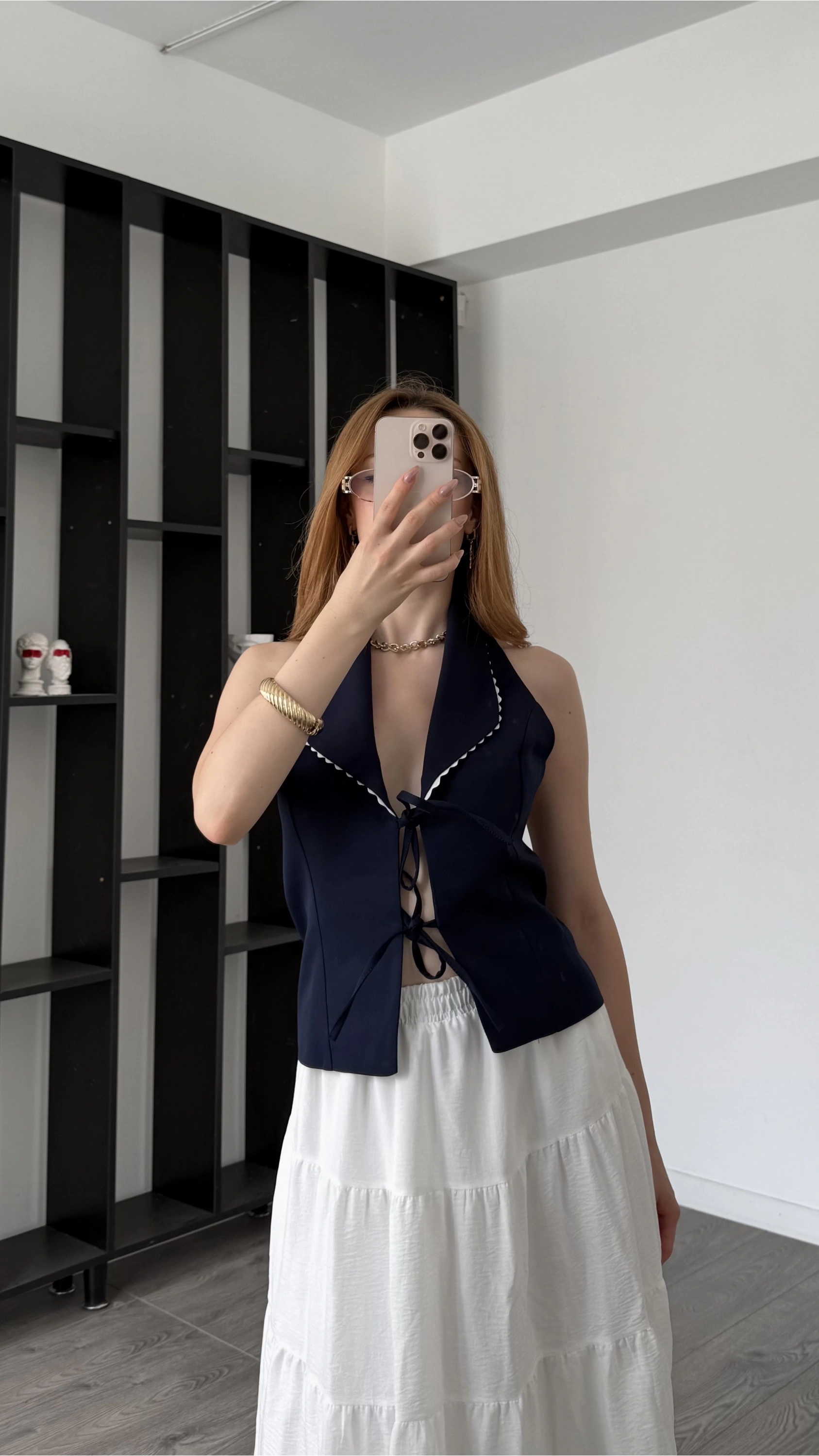 Lacivert Vionna Yaka Detaylı Bağcıklı Yelek