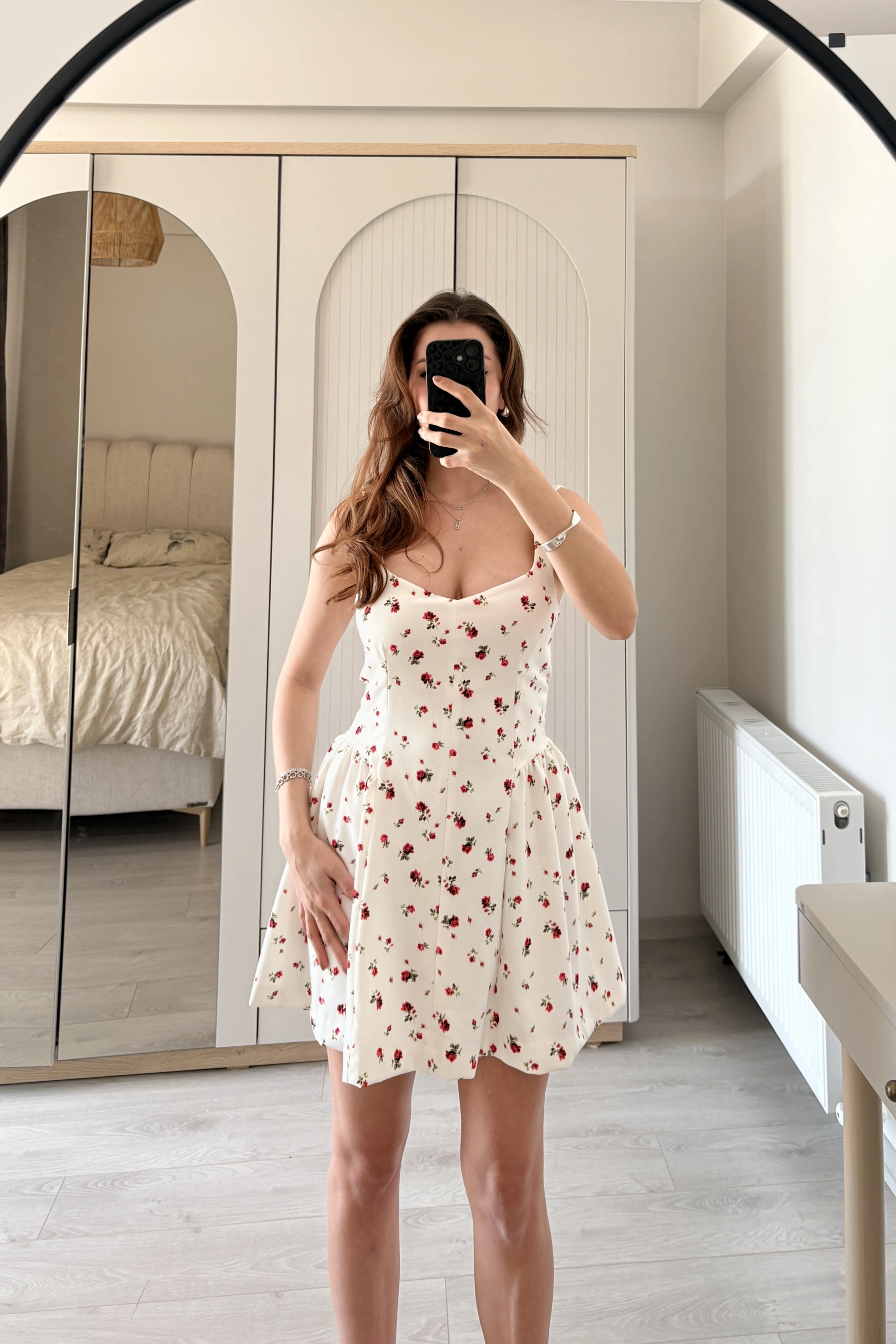 Pembe Düğme Detay Korse Bel Kloş Kısa Elbise
