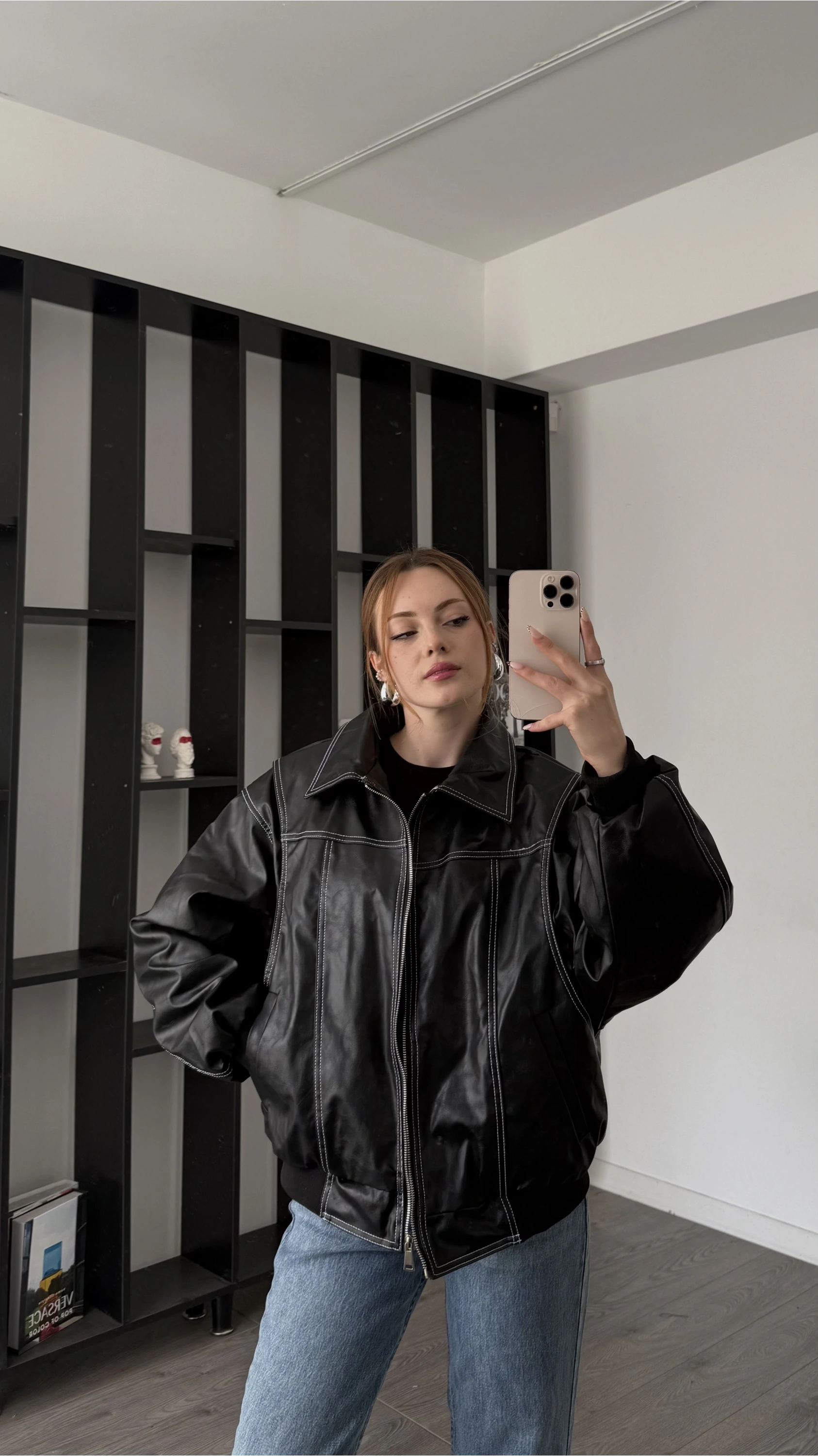 Siyah Amy Dikiş Detaylı Oversize Deri Ceket
