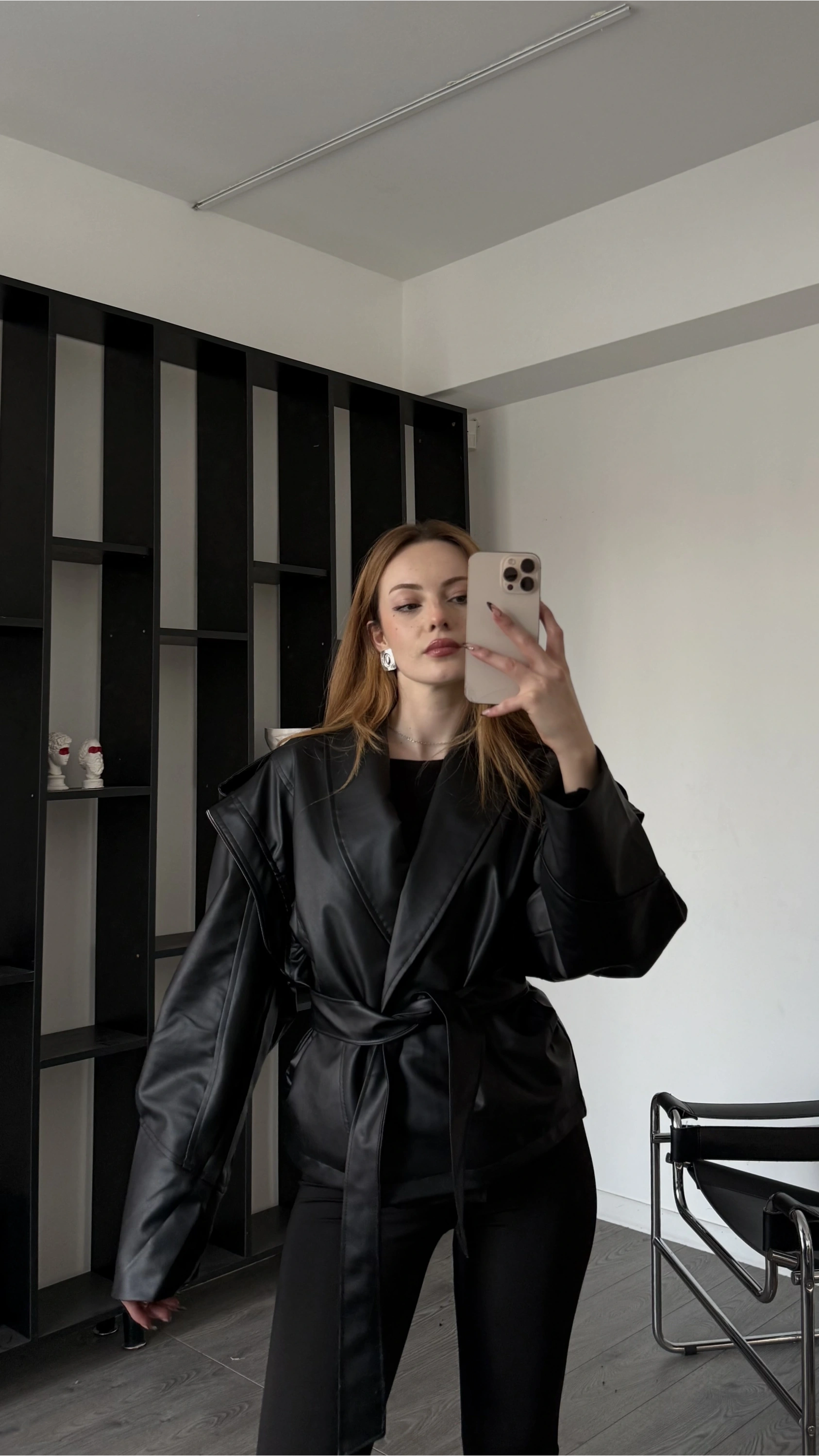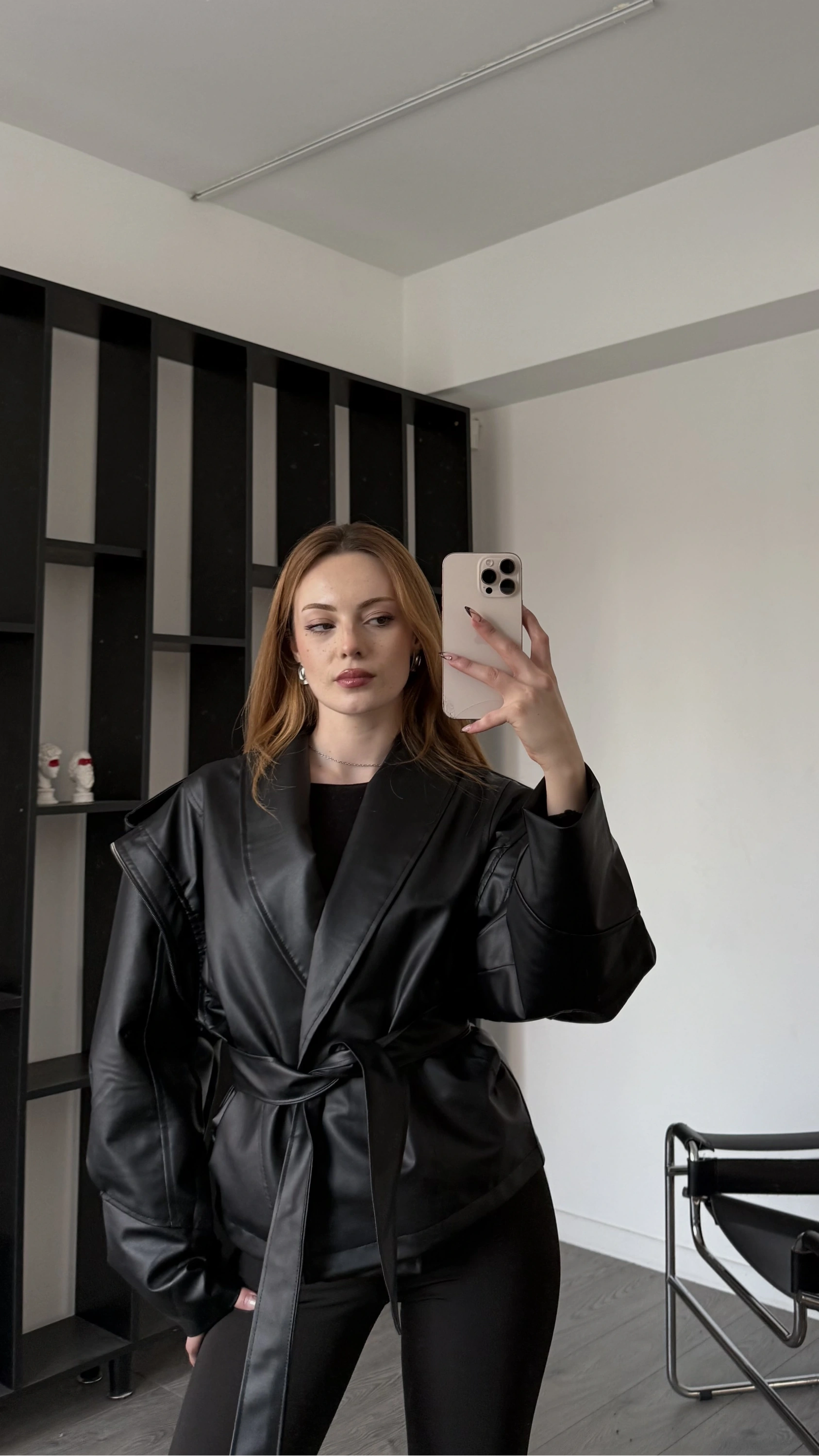 Siyah Anja Tasarım Kuşaklı Deri Ceket
