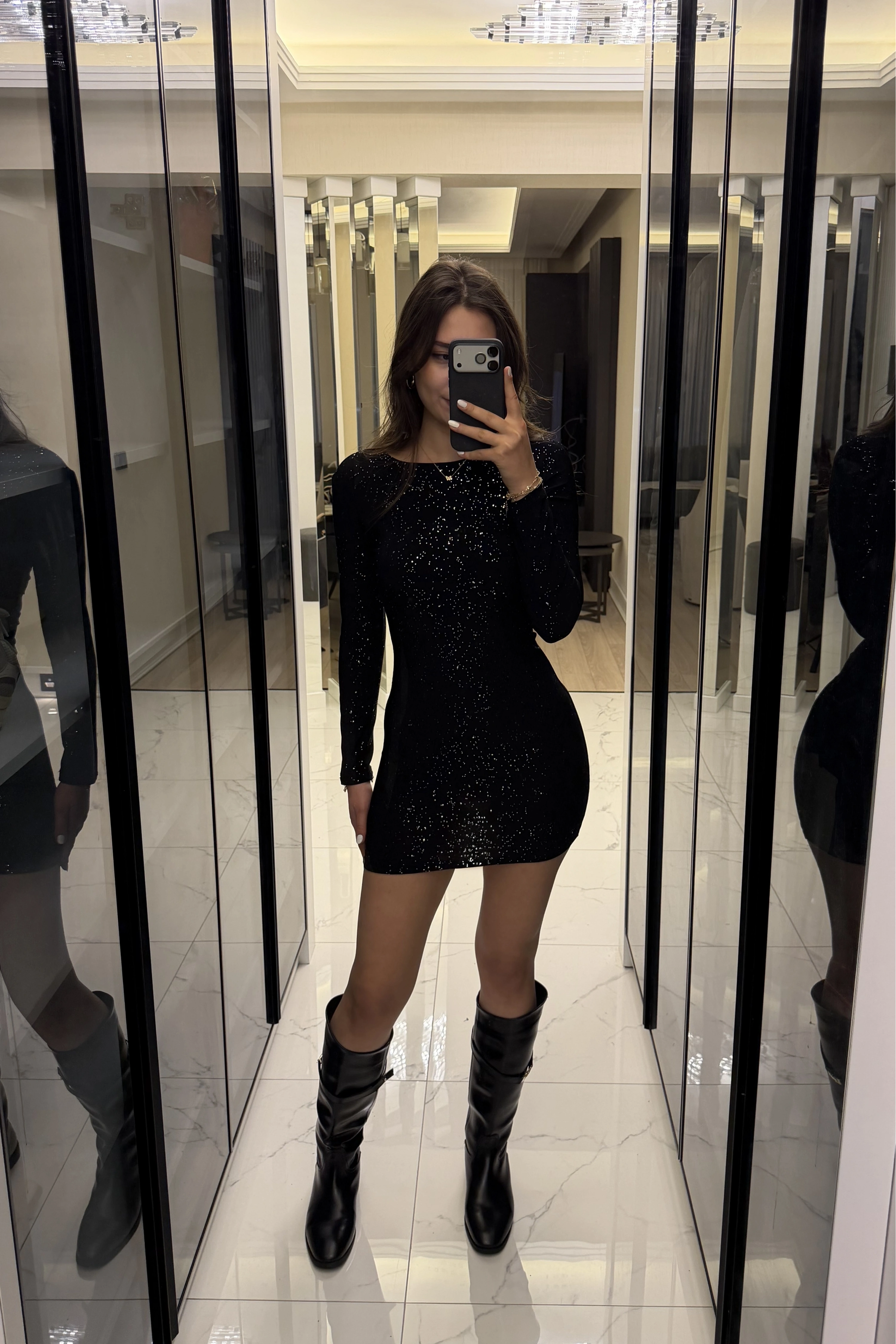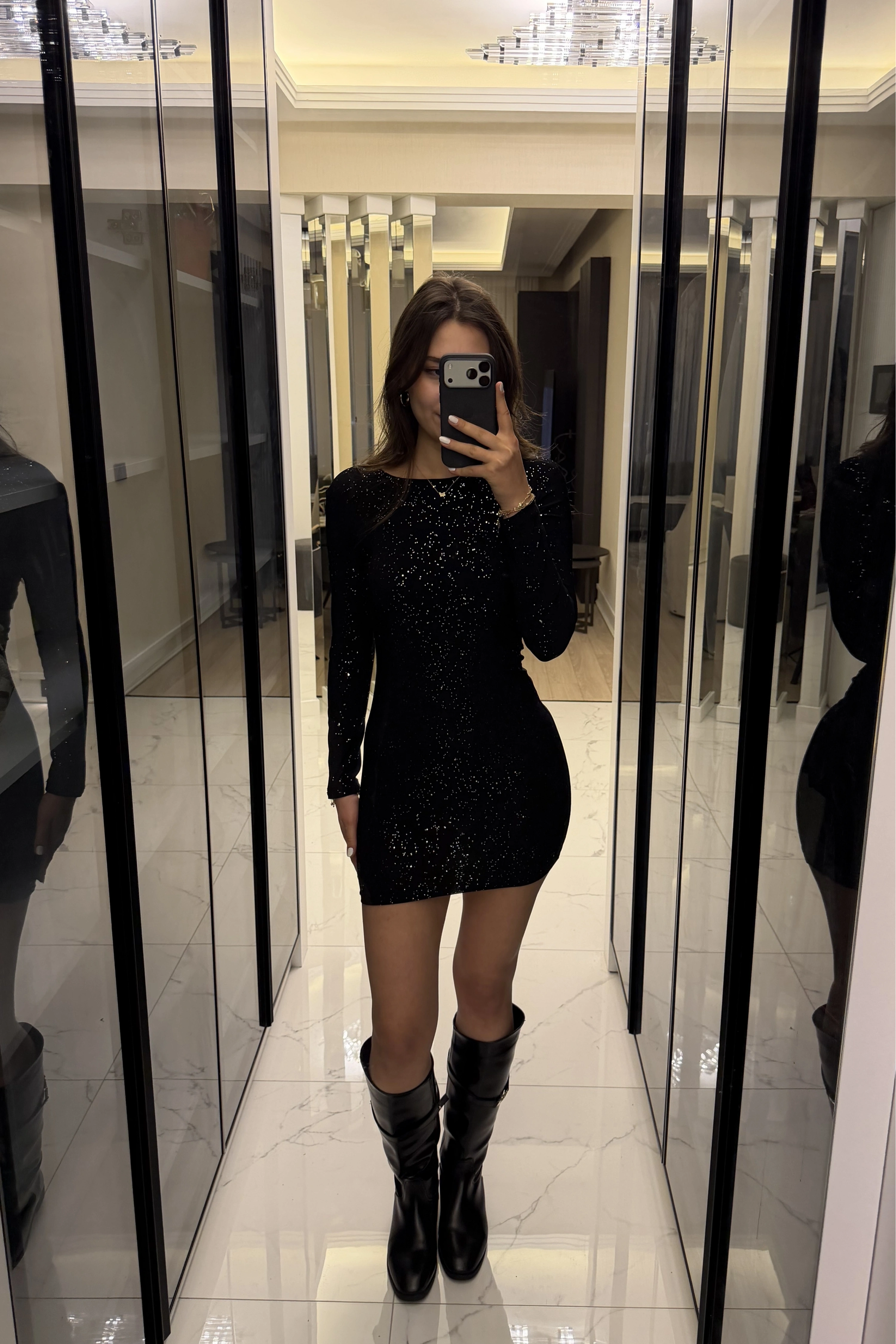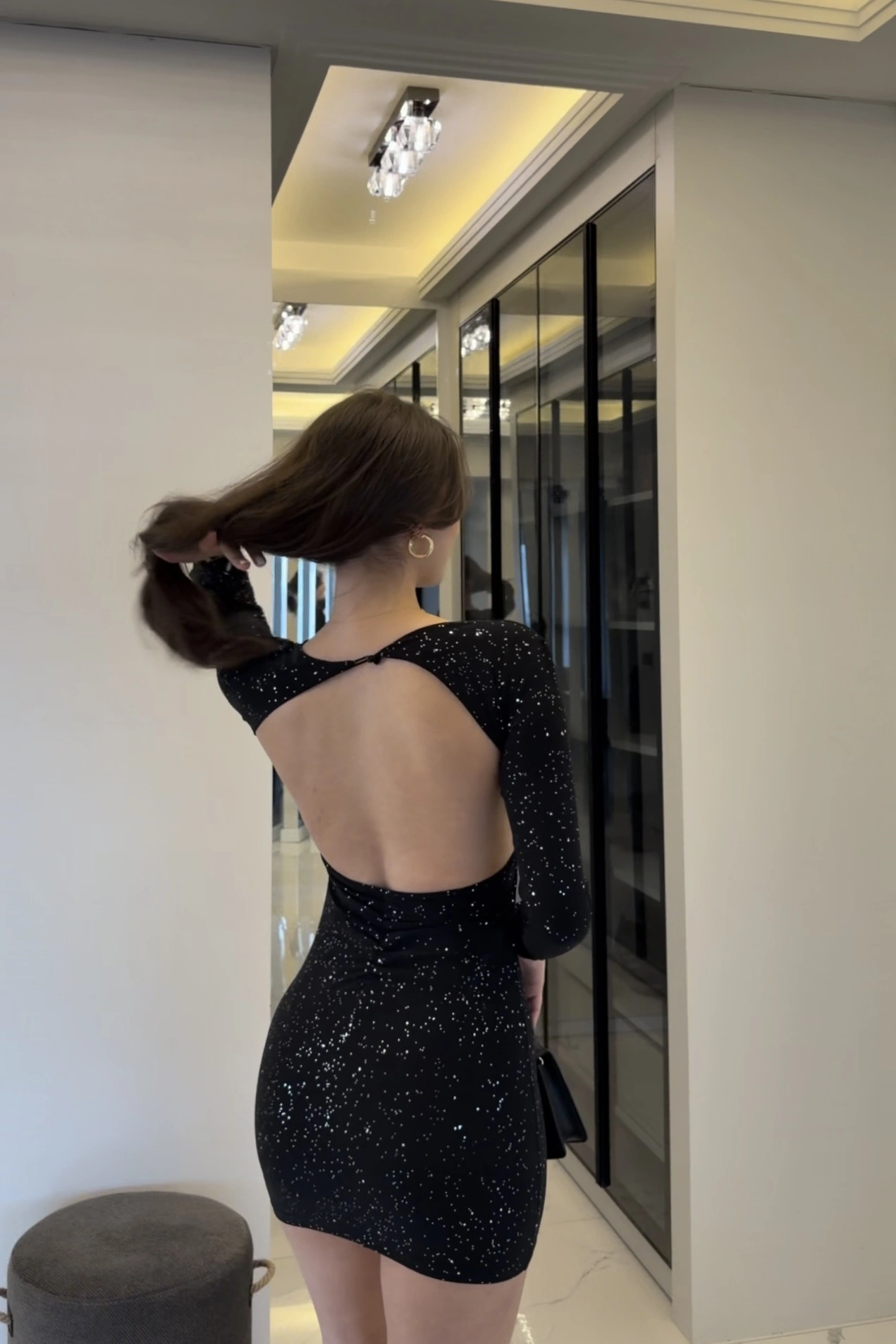 Siyah Işıltılı Sırt Dekolteli Mini Elbise