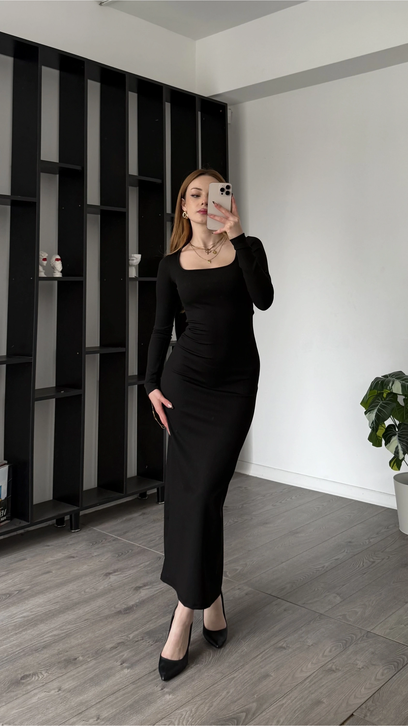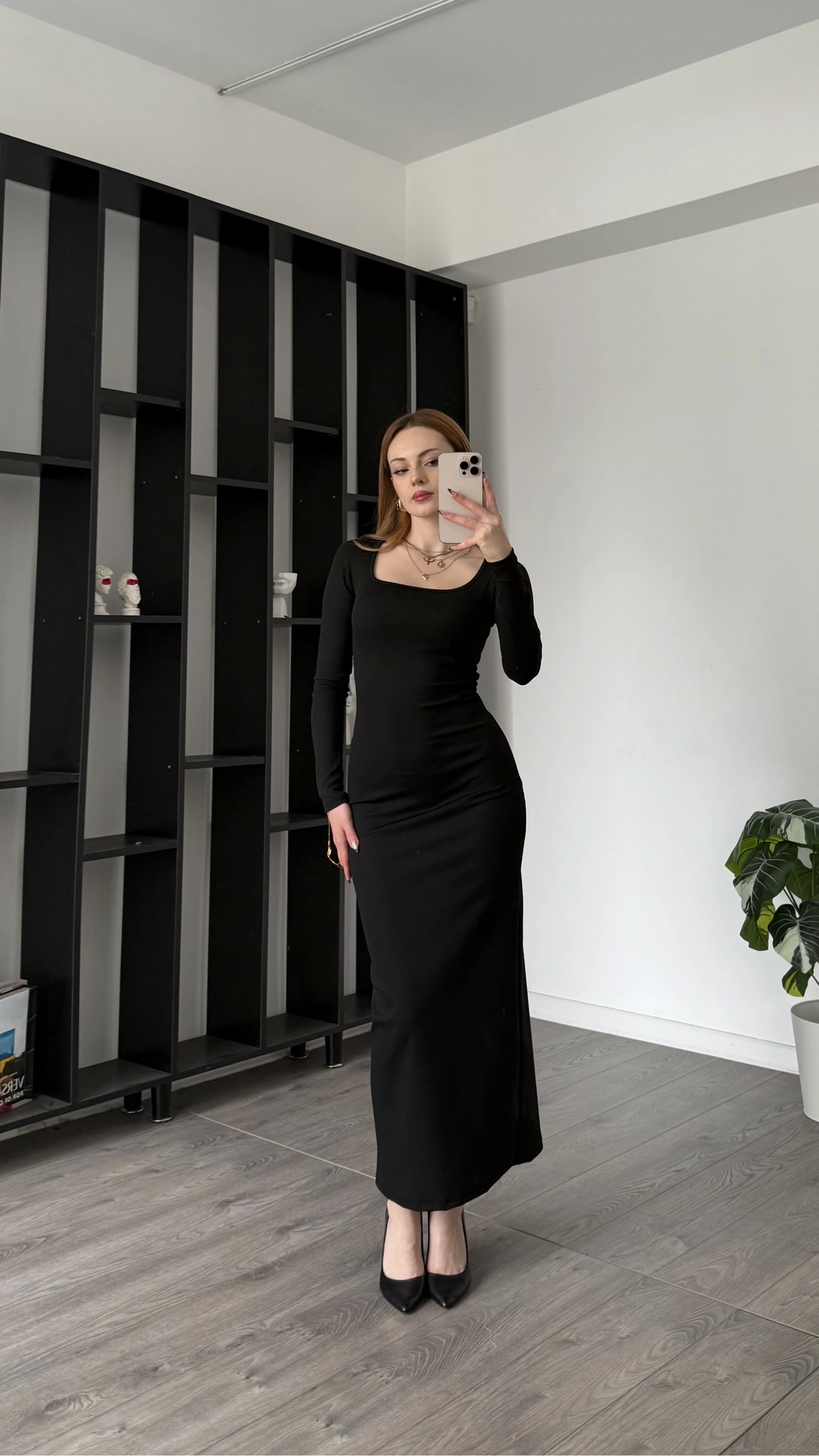Siyah Luis Kare Yaka Basic Uzun Elbise