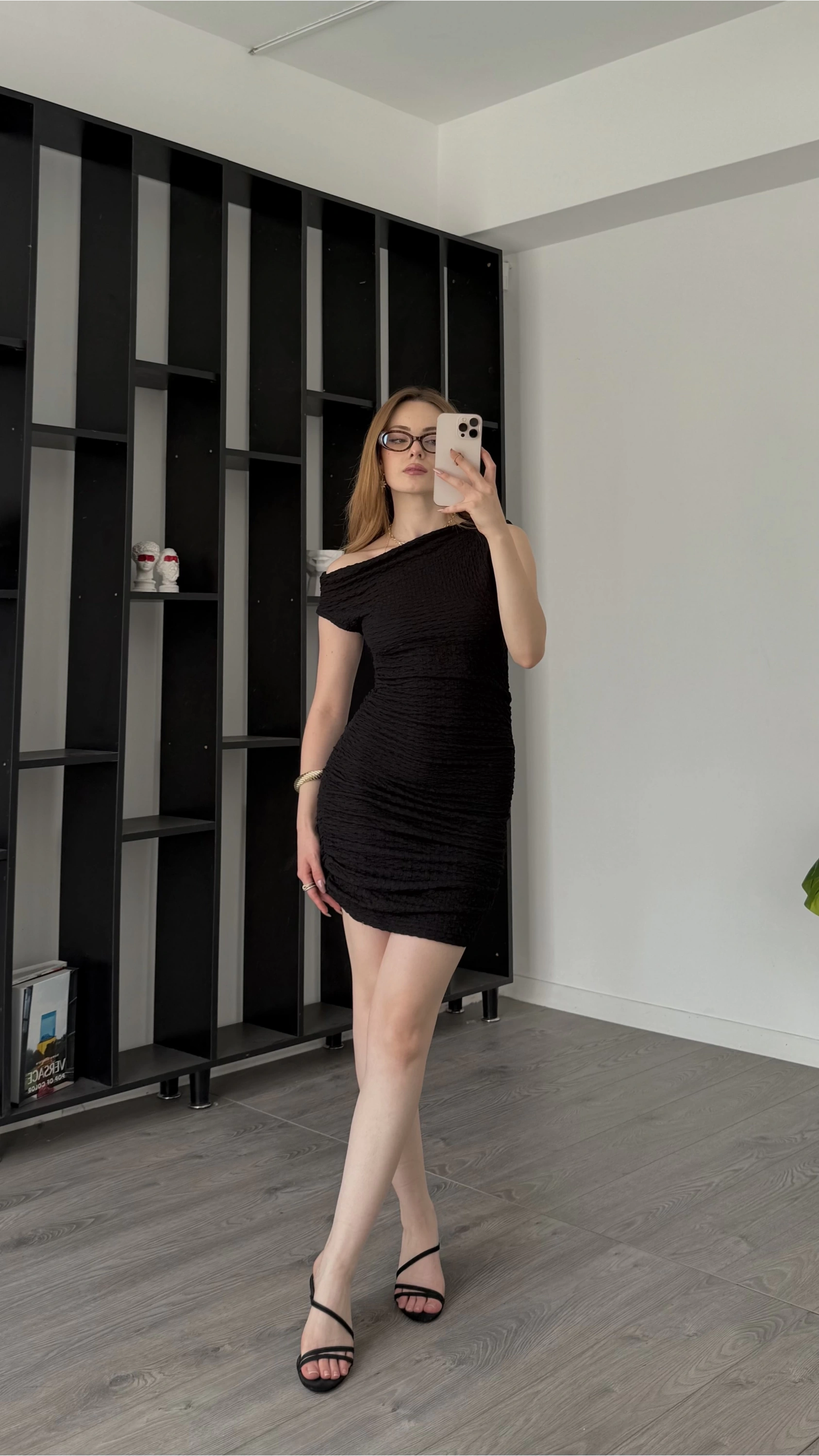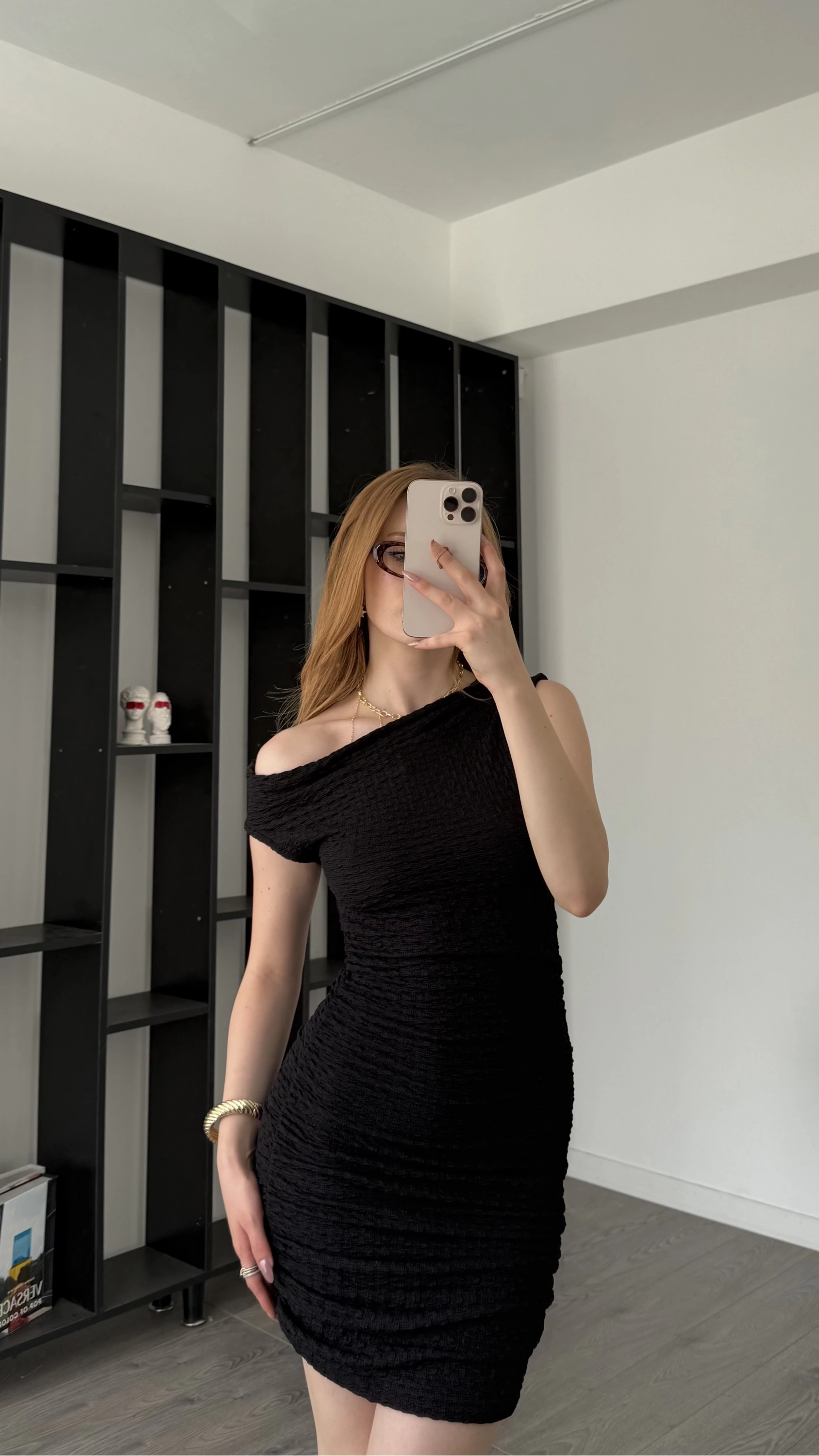Siyah Melys Bürümcük Düşük Omuzlu Elbise