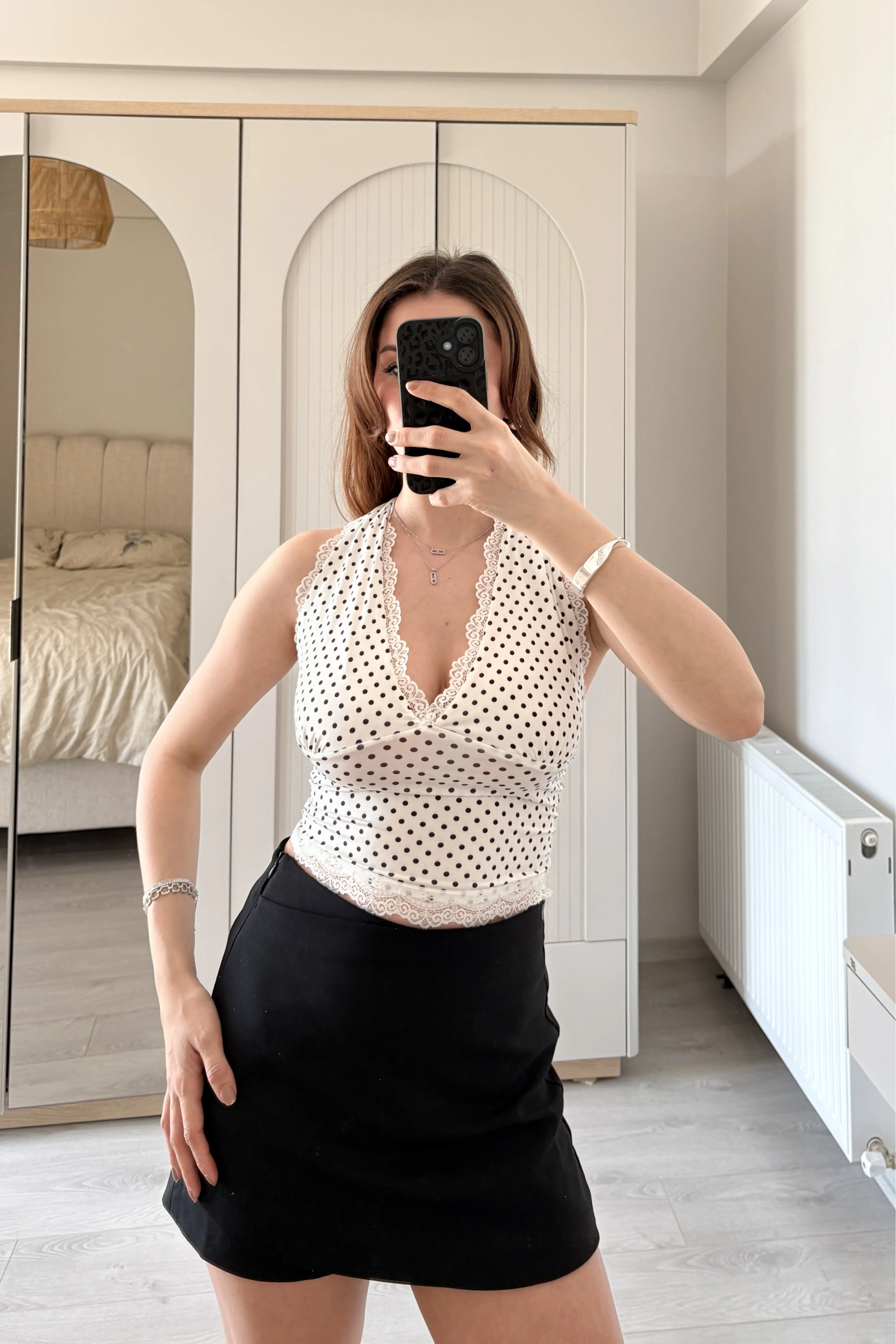 Detay: feminen görünüm kazandıran dantel detayı ve puantiye deseni