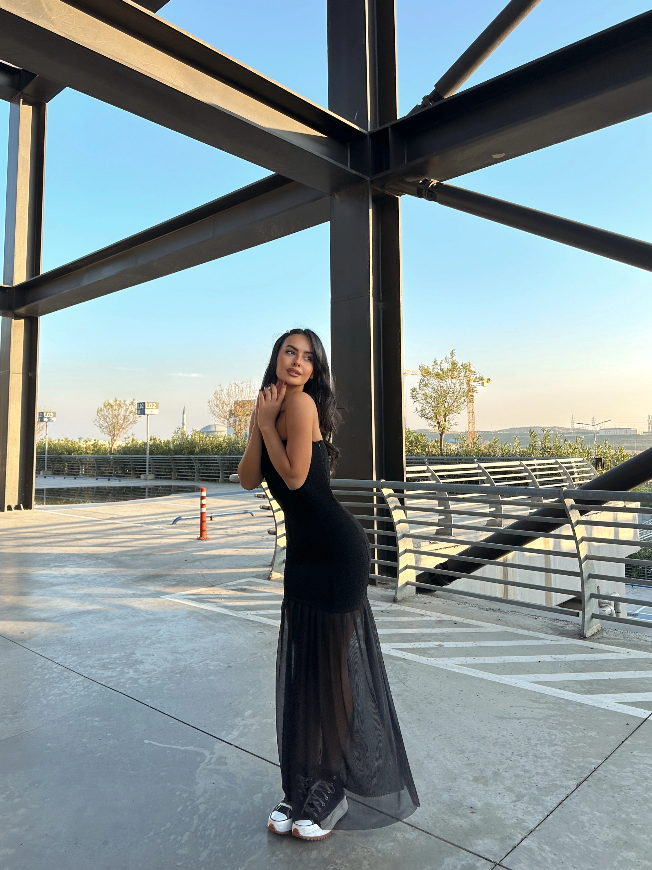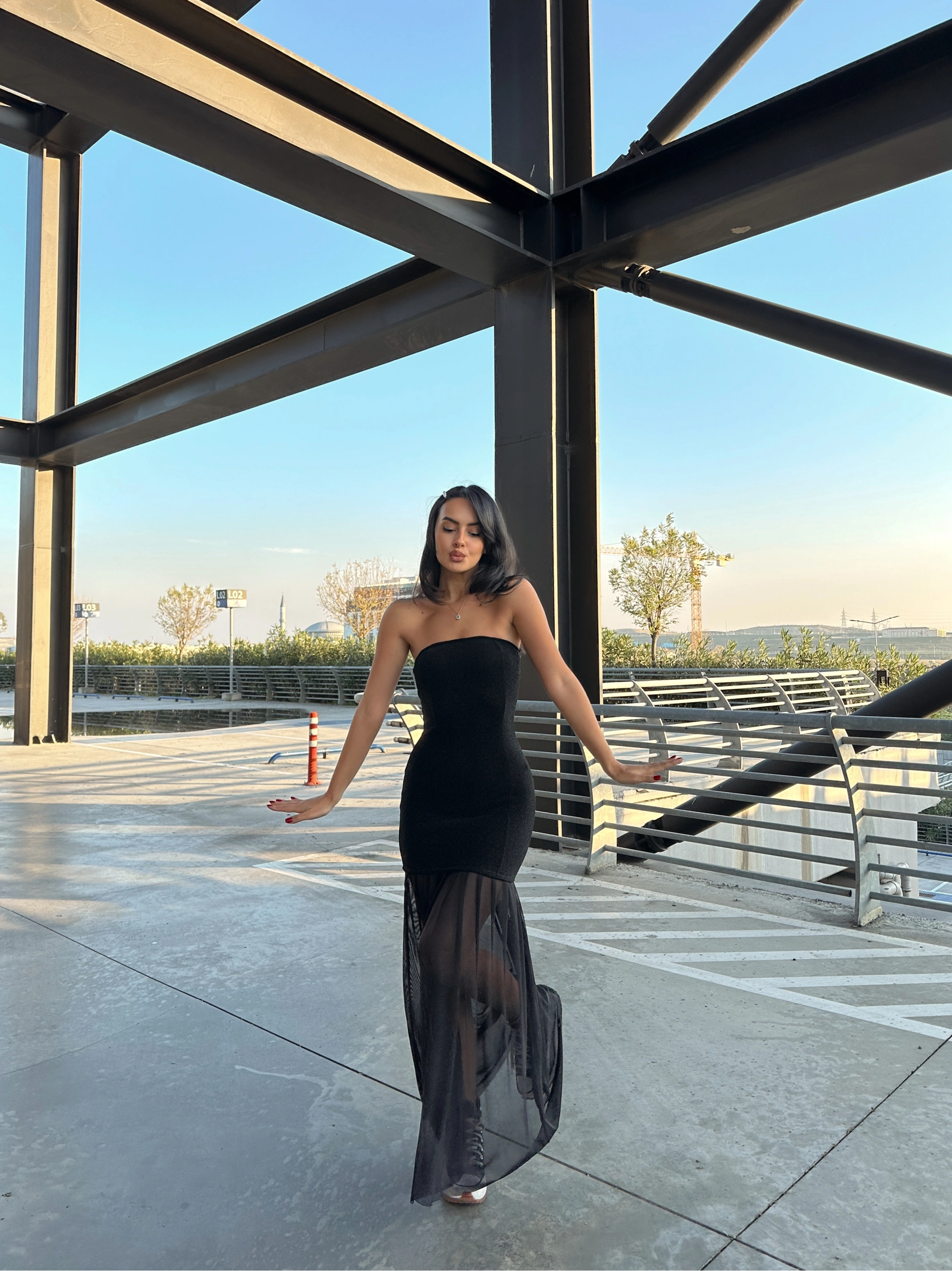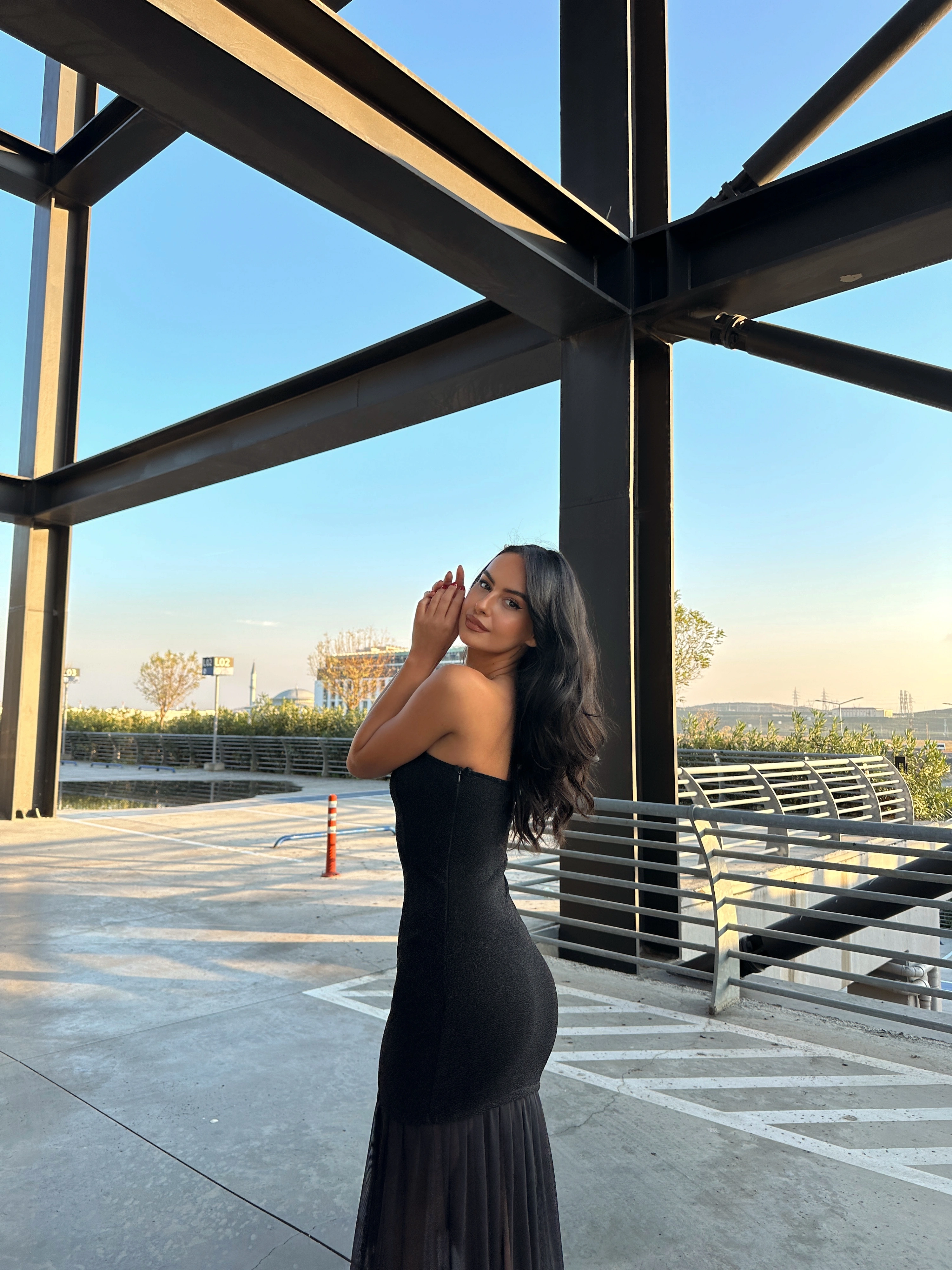 Siyah Tül Etekli Işıltılı Straplez Elbise