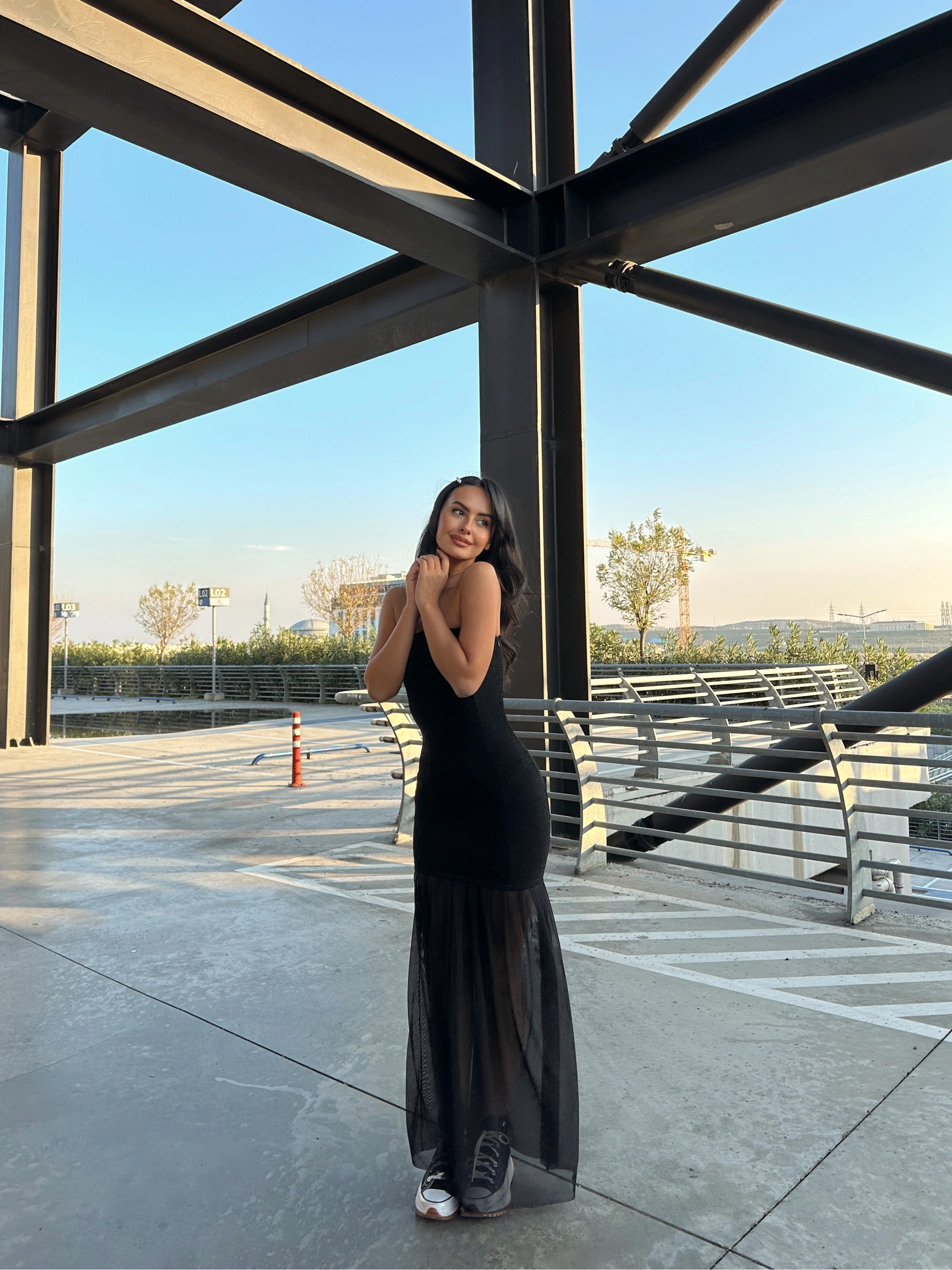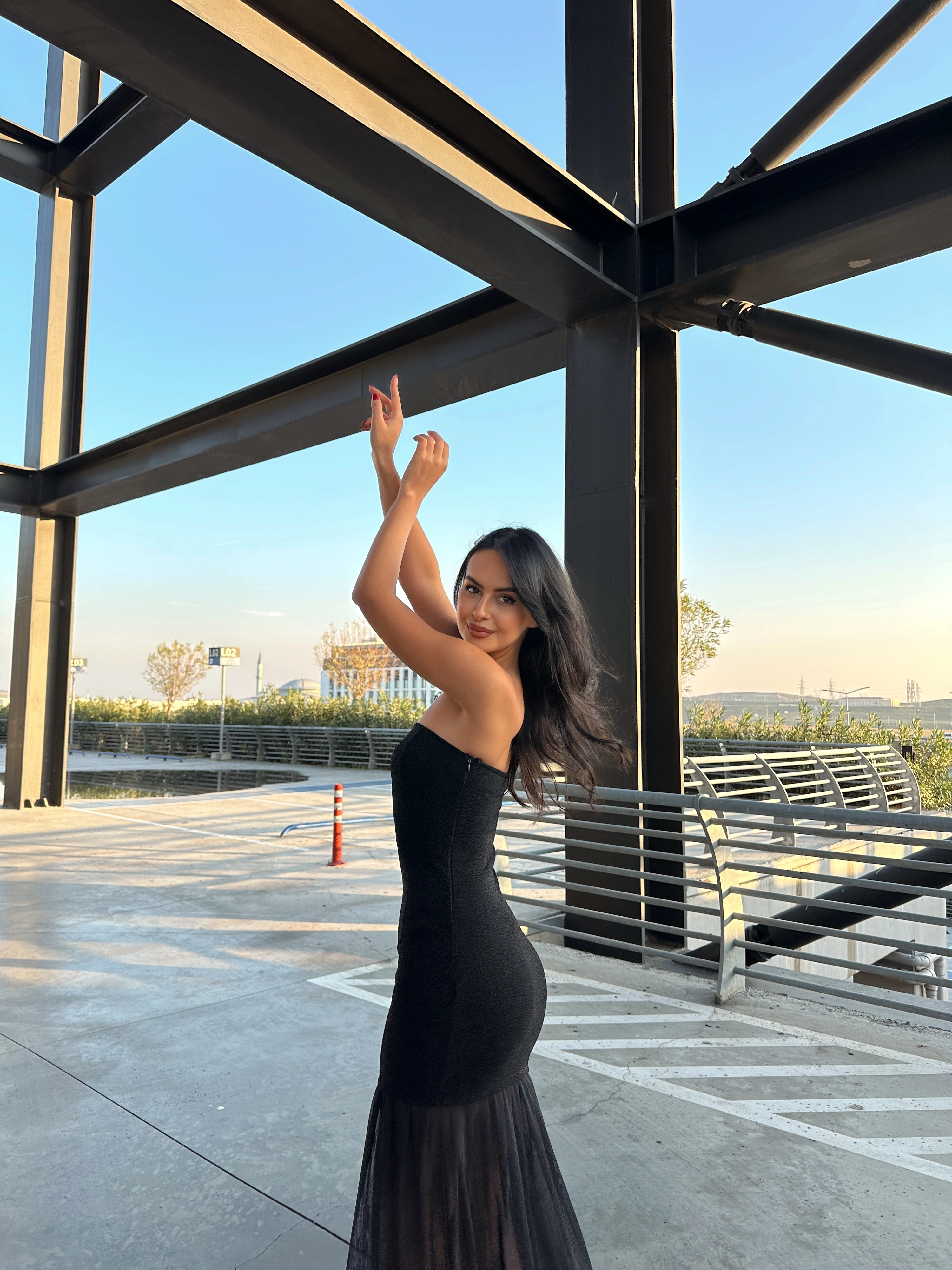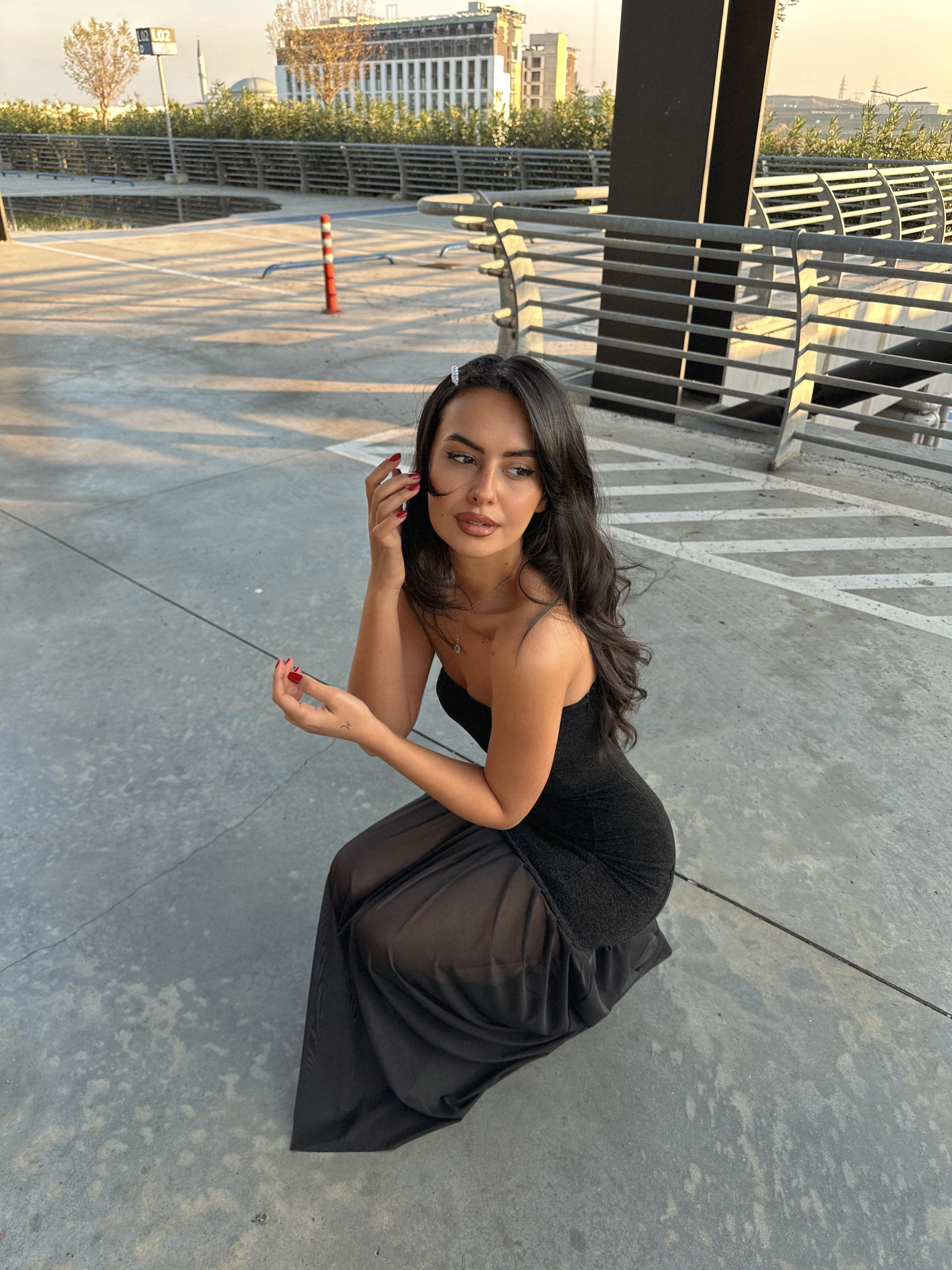 Siyah Tül Etekli Işıltılı Straplez Elbise