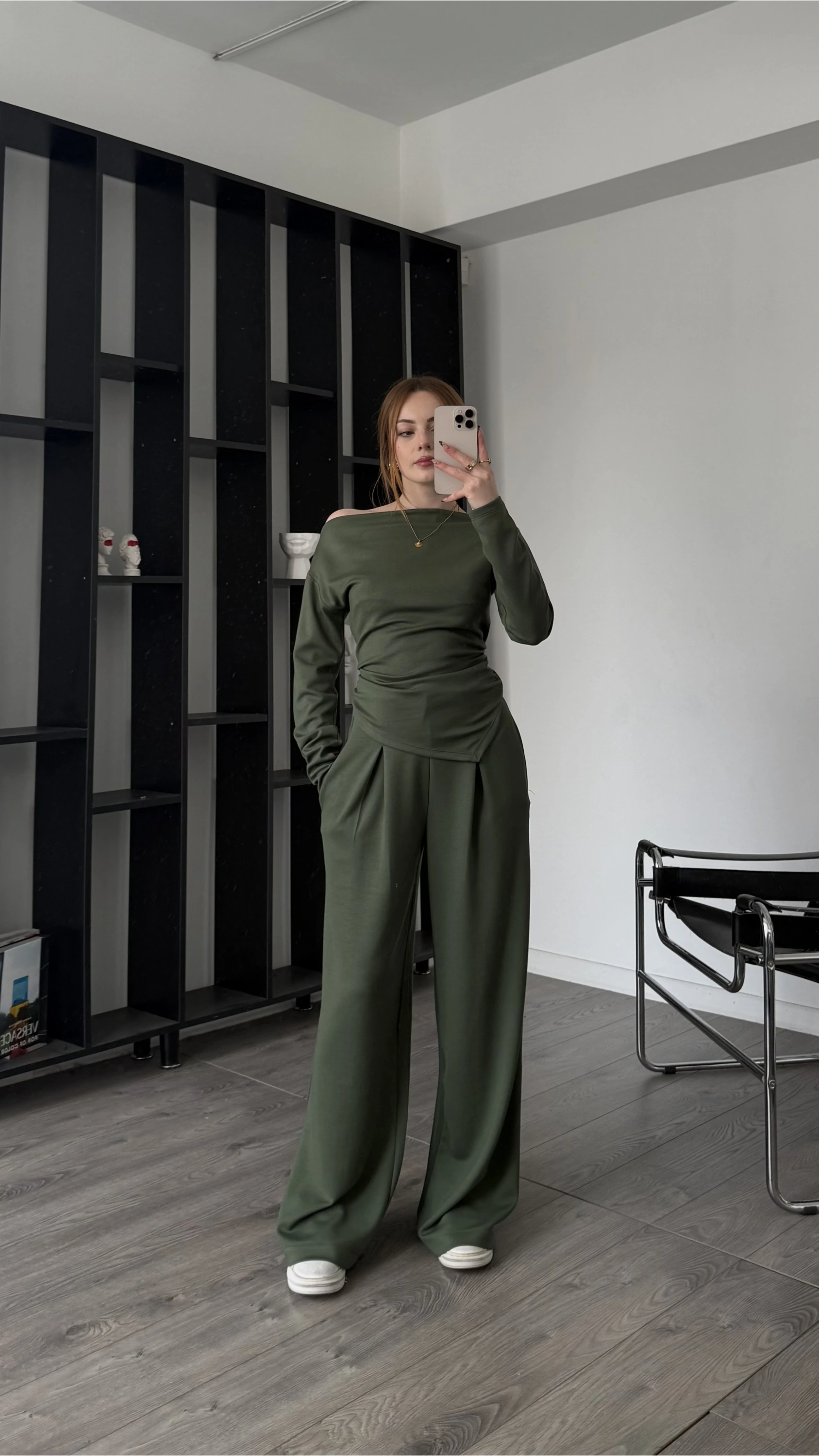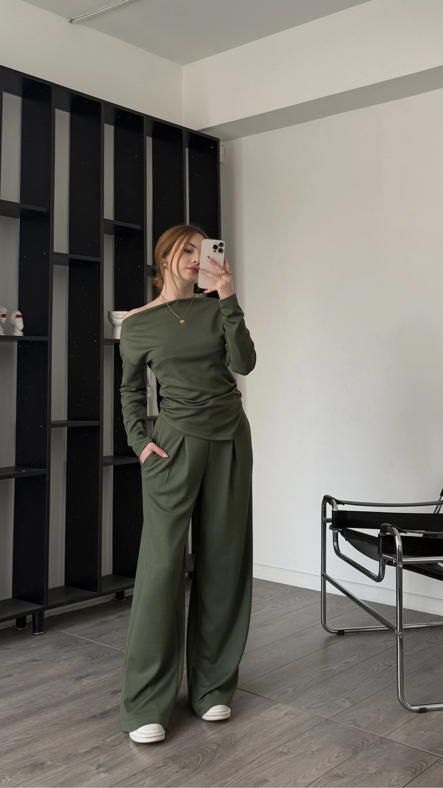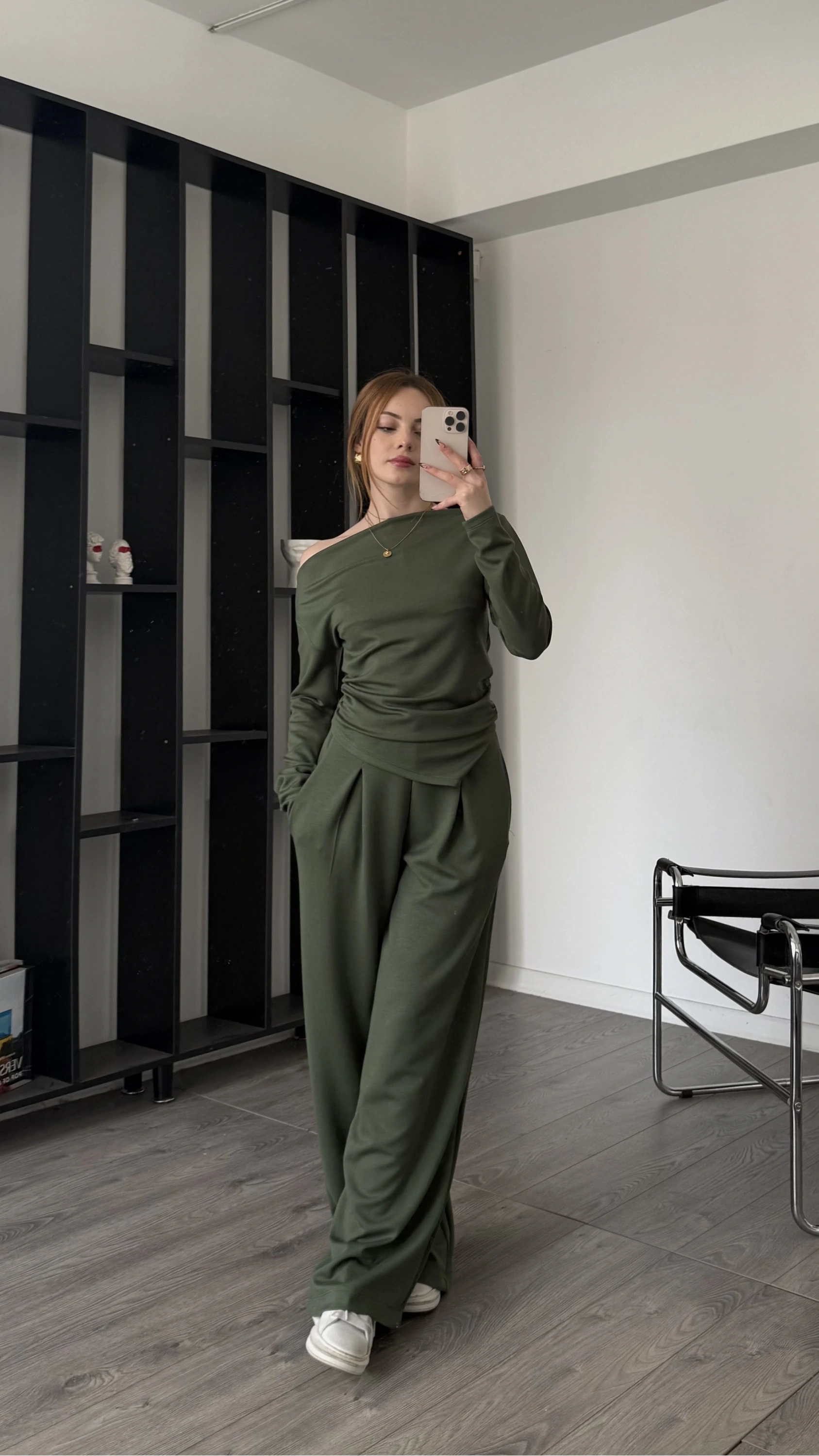 Yeşil Lumi Asimetirk Kayık Yaka Modal Takım